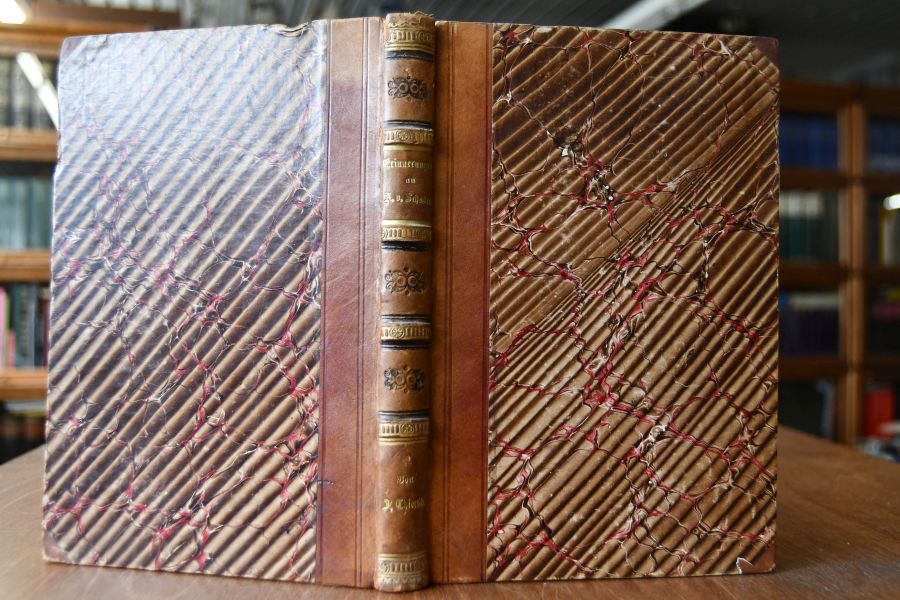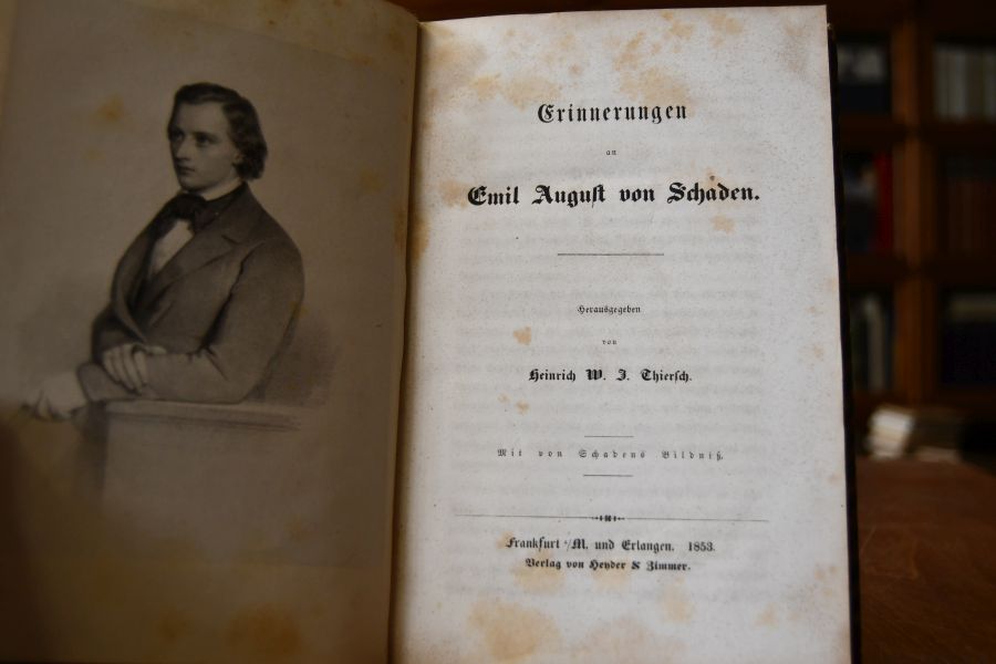 Beschreibung Einband berieben und bestoßen. Am Rücken mit Einriss. Immer wieder fleckig. Der 1852 mit 38 Jahren früh verstorbene Erlanger Philosoph v. Schaden gehörte in der nachhegelschen Philosophie zu den Vertretern eines spekulativen Theismus. Er war insbesondere von Baader beeinflußt und gehörte zu den Mitherausgebern von dessen Werken. Der vorliegende Band enthält einleitend die Biographie Schadens von Thiersch sowie Erinnerungen seines früheren Hauslehrers. Die zweite Abteilung (ab S. 69) mit Stücken aus Schadens Nachlaß, Briefe aus Italien 1845; Drei Vorträge über Geschichte der italienischen Malerei; Über die Musik und ihre Entwicklung im Alterthum u.a.