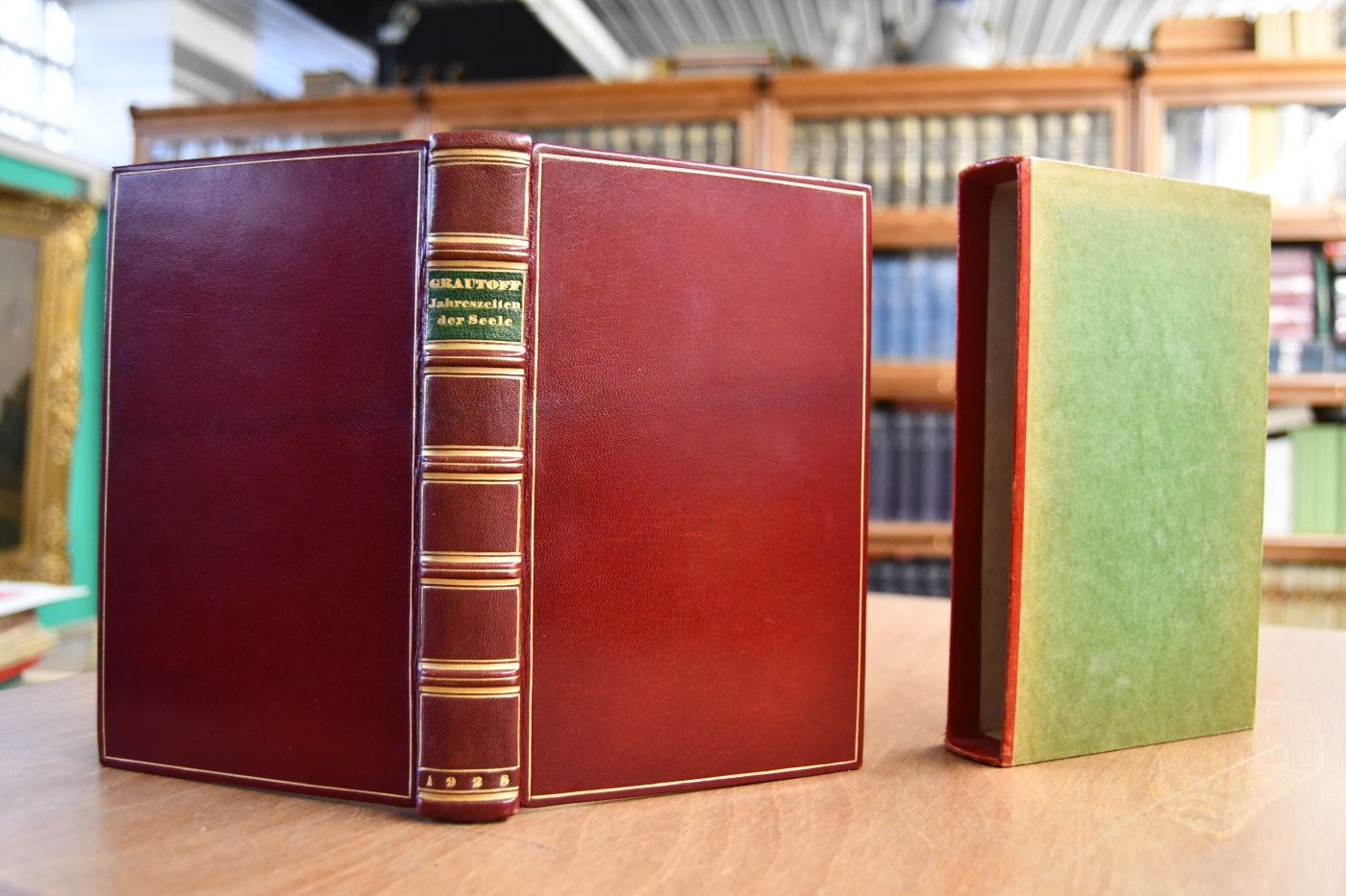 Beschreibung Handgarbeiteter Einband aus gelättetem Kalbsleder mit Rücken-, Deckel-, Steh- und Innenkantenvergoldung im handgefertigten Schuber.