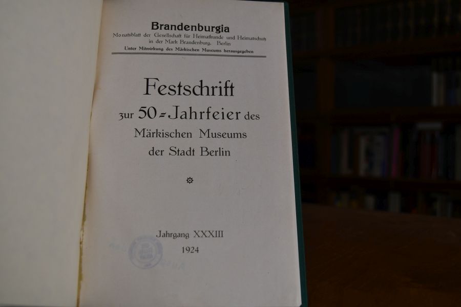 "Brandenburgia". Monatsblatt der Gesellschaft für Heimatkunde der Provinz Brandenburg zu Berlin. Festschrift zur 50-Jahrfeier des Märkischen Museums der Stadt Berlin. Jahrgang XXXIII. 1924.
