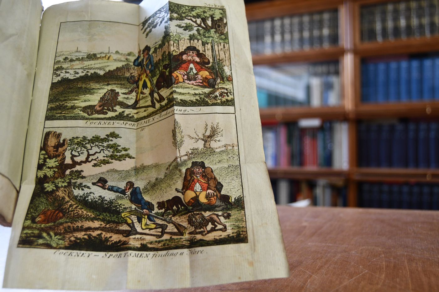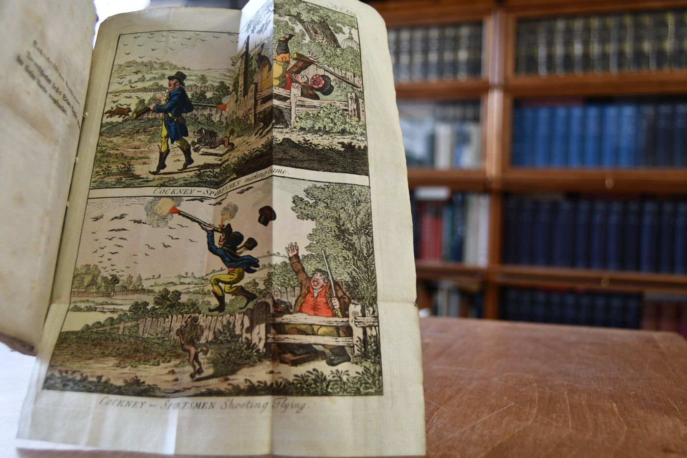 Beschreibung Einband berieben, bestoßen, angeschmutzt, mit Einrissen und eselsohrig. Durchgehend eselsohrig und fleckig. Enthält 4 altkolorierte Karikaturen von James Gillray, Cockney Sportsmen: 1. "Cockney Sportsmen Marking Game", 2. "Cockney Sportsmen Shooting Flying", 3. "Cockney Sportsmen Recharging", 4. "Cockney Sportsmen Finding A Hare".