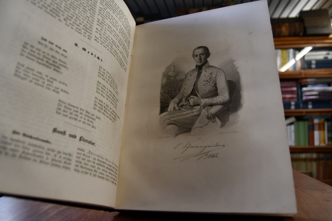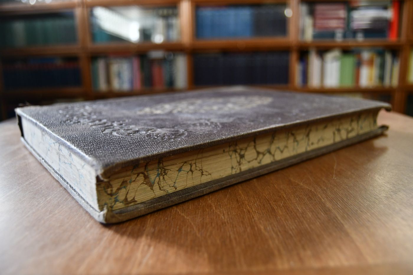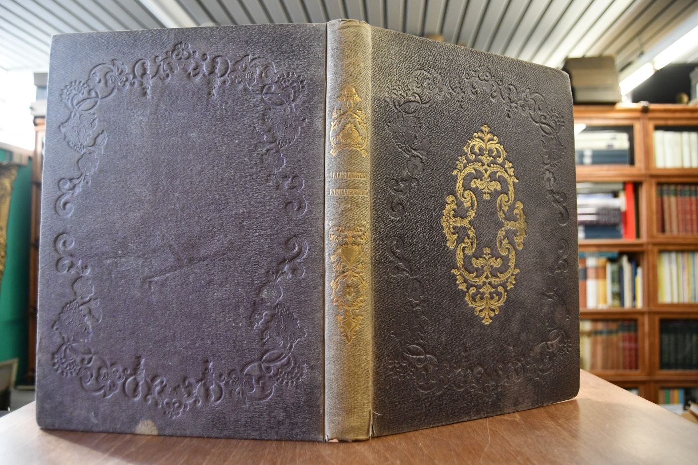Format 33 x 24 cm, geprägtes Leinen mit Deckel- und Rückenvergoldung sowie umlaufendem marmorierten Schnitt
