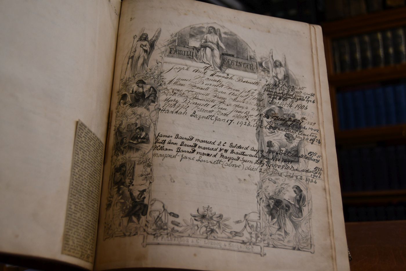 Beschreibung Einband berieben und bestoßen. Durchgehend etwas fleckig, am Anfang und am Ende stärker. Familienregister mit Eintragungen der Familie Barnett aus Ulverston (Nordengland). Einige eingeklebte Zeitungsartikel und Ankündigungen.