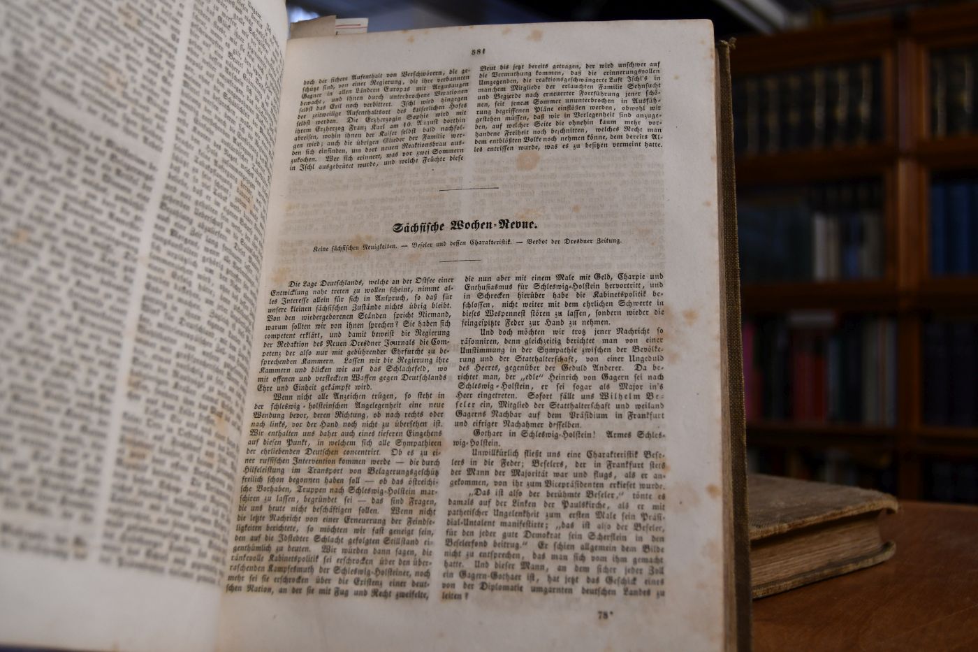 Beschreibung Einband berieben, bestoßen, angeschmutzt und fleckig. Durchgehend fleckig. Kirchner 10066, "Ernst Keil (* 6. Dezember 1816 in Langensalza; † 23. März 1878 in Leipzig) war ein deutscher Buchhändler, Verleger, unter anderem Herausgeber und Begründer der Familienzeitschrift Die Gartenlaube. Ernst Keil wurde in der Marktstraße in Langensalza als Sohn eines Gerichtsbeamten geboren.[1] Er erlernte in Weimar Buchhandel, trat danach 1837 als Gehilfe in die Weygandsche Buchhandlung zu Leipzig ein und wandte sich hier bald auch dem Journalismus zu. 1838 übernahm er die Redaktion des Journals Unser Planet (später Wandelstern), das unter seiner Leitung eines der am meisten gelesenen Blätter damaliger Zeit wurde. Nachdem er 1845 ein eigenes buchhändlerisches Geschäft in Leipzig gegründet hatte, rief er ein Jahr später das Monatsblatt Der Leuchtthurm ins Leben, das er auch selbst redigierte. Dieses Organ bezeichnete in der Geschichte des vormärzlichen Journalismus eine bedeutsame Wendung, indem es, unterstützt von angesehenen Vertretern der liberalen Bewegung (Robert Blum, Johann Jacoby, Gustav Adolf Wislicenus, Leberecht Uhlich und anderen), der erste volkstümliche Ausdruck des erwachten Befreiungsdranges auf politischem und religiösem Gebiet wurde. Unaufhörliche Verfolgungen vonseiten der Polizei zwangen zu häufigem Wechsel des Verlagsorts, bis endlich die Märztage von 1848 Pressefreiheit brachten und das Blatt selbst in Leipzig erscheinen durfte. Mit dem Sieg der Reaktion begannen die Verfolgungen von neuem; die Zeitschrift wurde 1851 unterdrückt und der sozialkritische Keil selbst zu einer neunmonatigen Gefängnisstrafe verurteilt, die er in Hubertusburg verbüßte. Im Gefängnis entstand die Idee für ein illustriertes Familienblatt, das vom 1. Januar 1853 an unter dem Titel Die Gartenlaube erschien und in kurzer Zeit eine große Verbreitung fand." (Wikipedia)