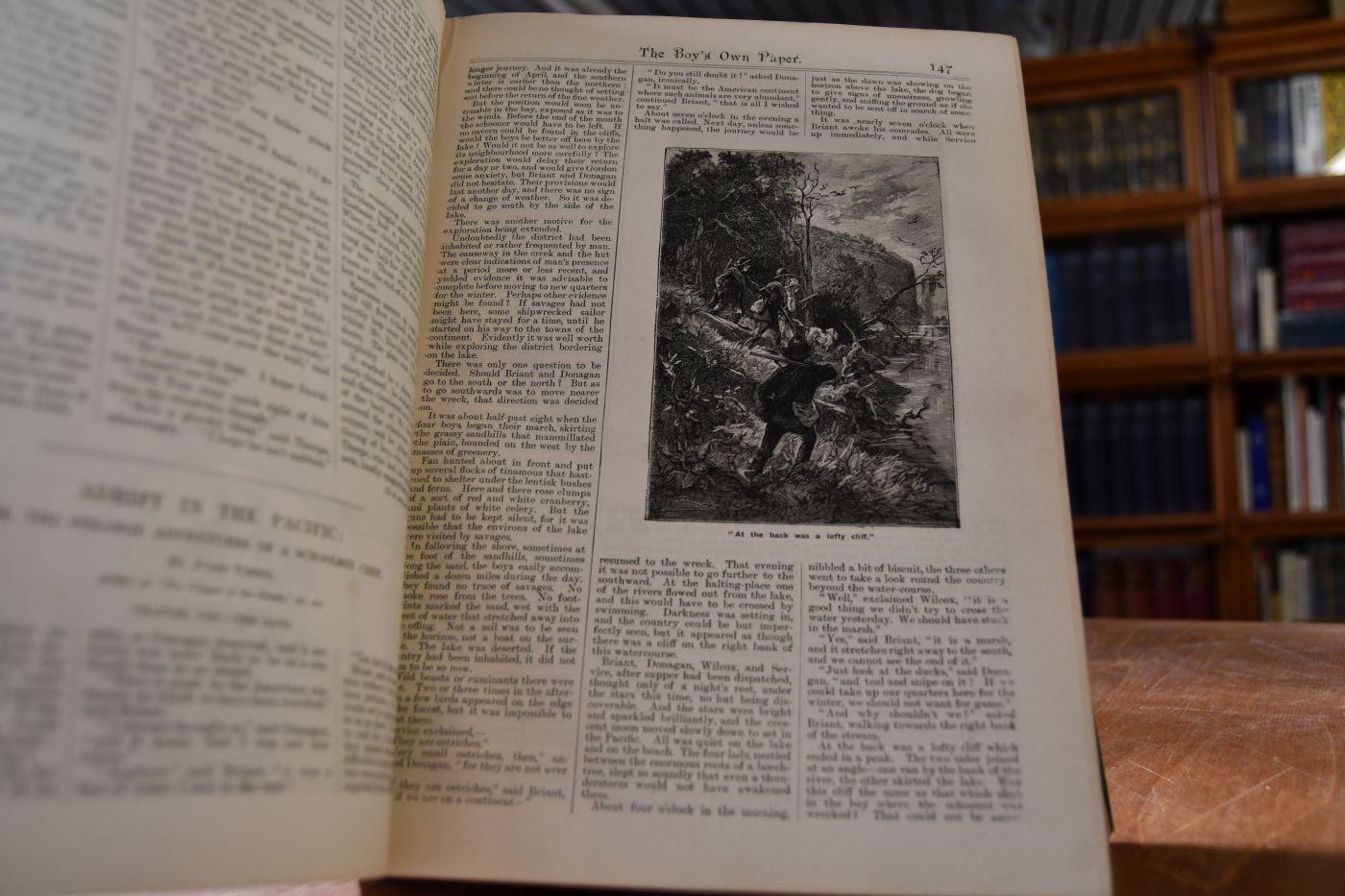 Beschreibung Einband berieben und bestoßen. Vorsätze fleckig. Schnitt fleckig. Bindung gelockert und einige Lagen vorgefallen. Immer wieder etwas fleckig. Frontinspizlitho mit Lösespuren. Mit der englischen Erstveröffentlichung von Jules Verne: Adrift in the Pacific.