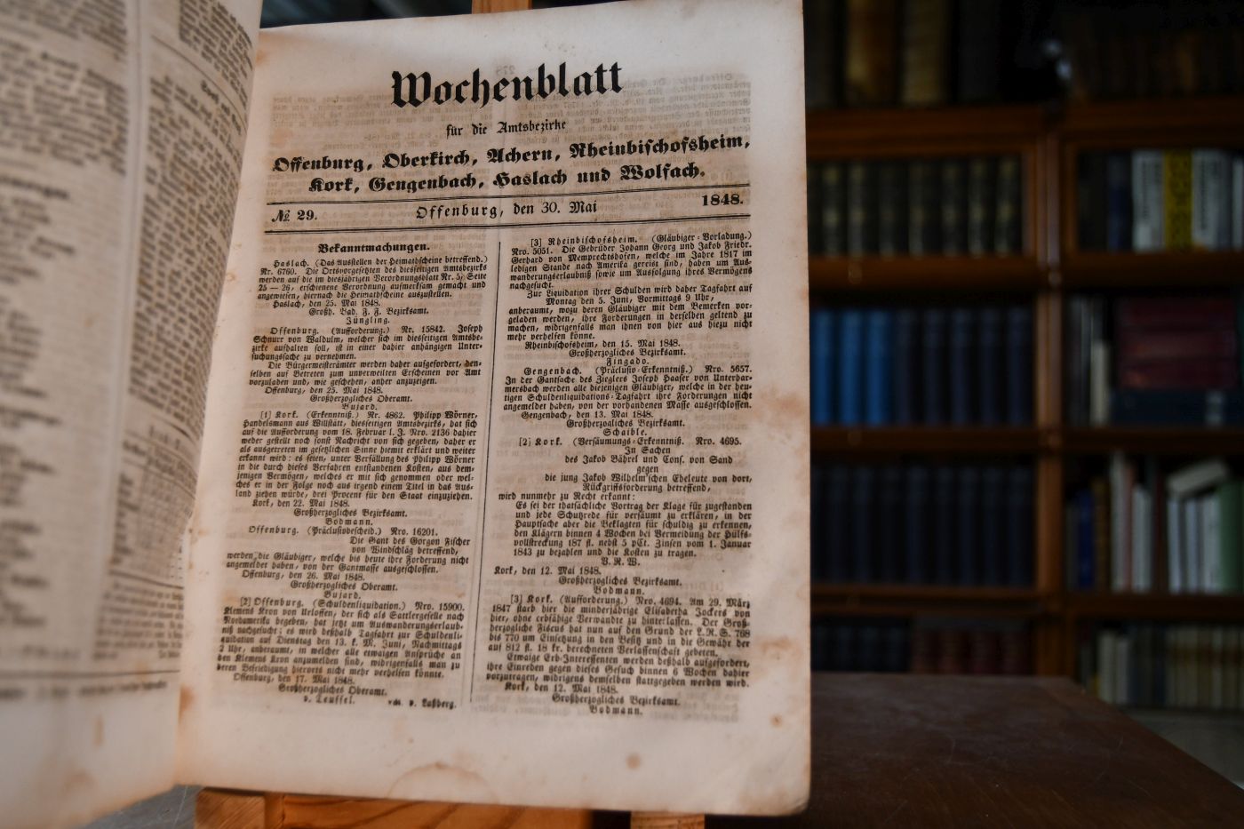 Wochenblatt für die Amtsbezirke Offenburg, Oberkirch, Achern, Rheinbischofsheim, Kork, Gengenbach, Haslach und Wolfach 1848. Es fehlen die Hefte 1, evtl. noch ein Heft 90 (letztes vorhandene Heft Nr. 89 vom 29. Dezember).