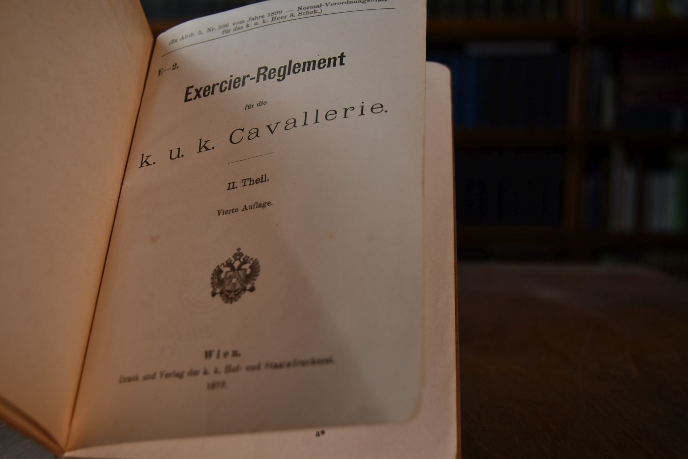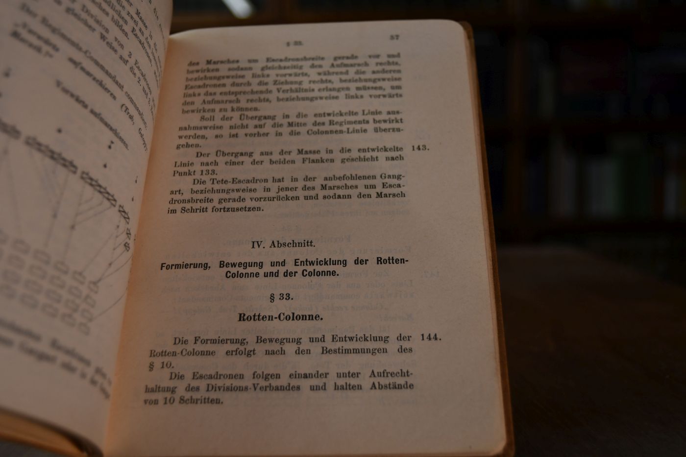 Beschreibung Einband berieben und angeschmutzt. Schnitt fleckig. Mit eingeklebtem I. Nachtrag auf dem hinteren Deckel. Handschriftlicher Besitzereintrag (k.u.k. Huss. Regmt Prinz zu Windisch-Grätz No. 11. Einj. Freiw. Baron Kotz) auf dem fliegenden Vorsatz. Bibliotheksexemplar mit den üblichen Stempeln und Eintragungen. Wenige Seiten mit Streichungen und eingeklebtem neuen Text.