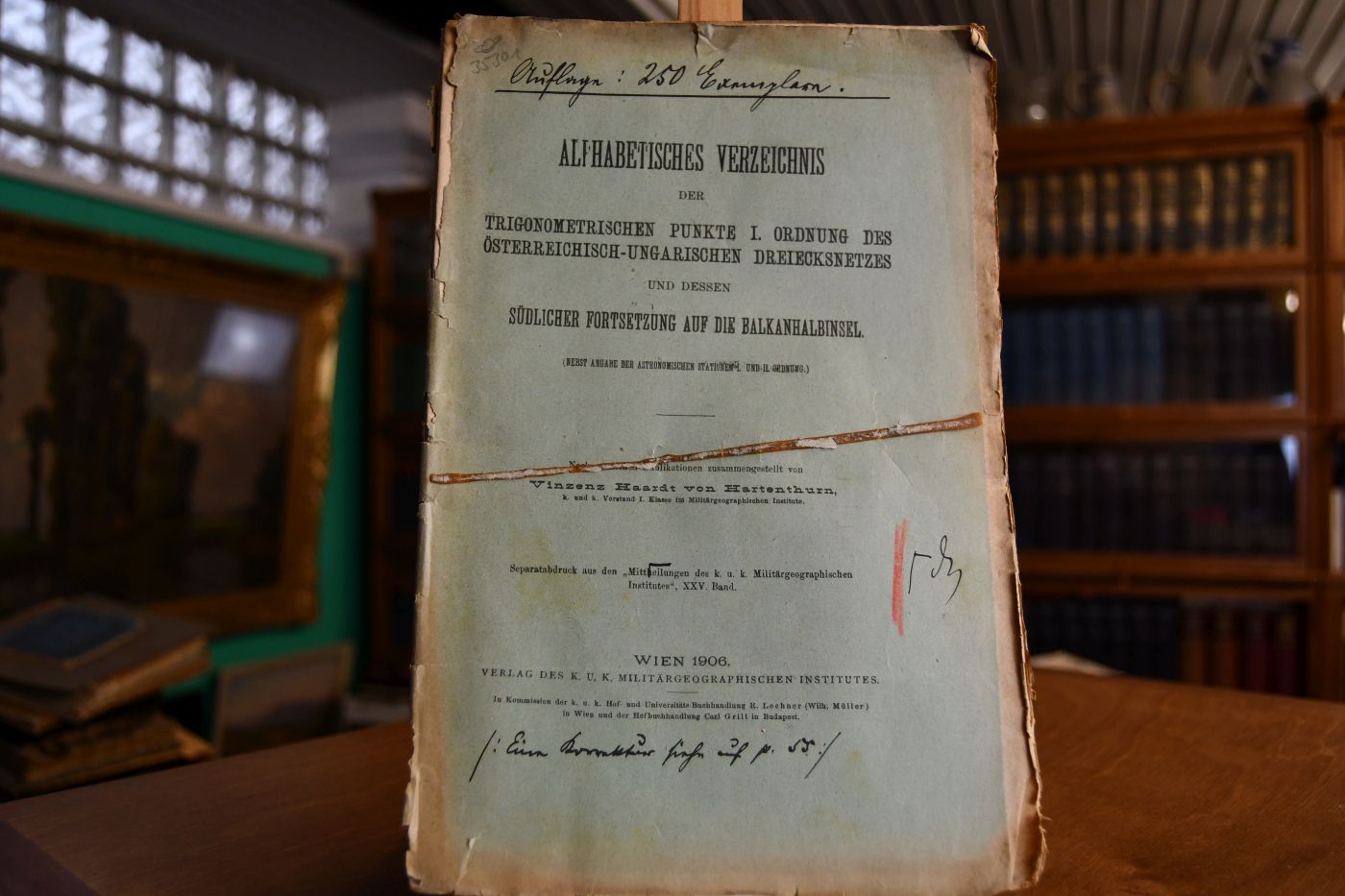 Beschreibung Einband berieben, bestoßen, gebräunt, mit Einrissen und Verlust. Aufhaftendes Gummi auf Vorderdeckel. Korrekturexemplar des Militärgeographischen Instituts mit einigen Korrekturen.