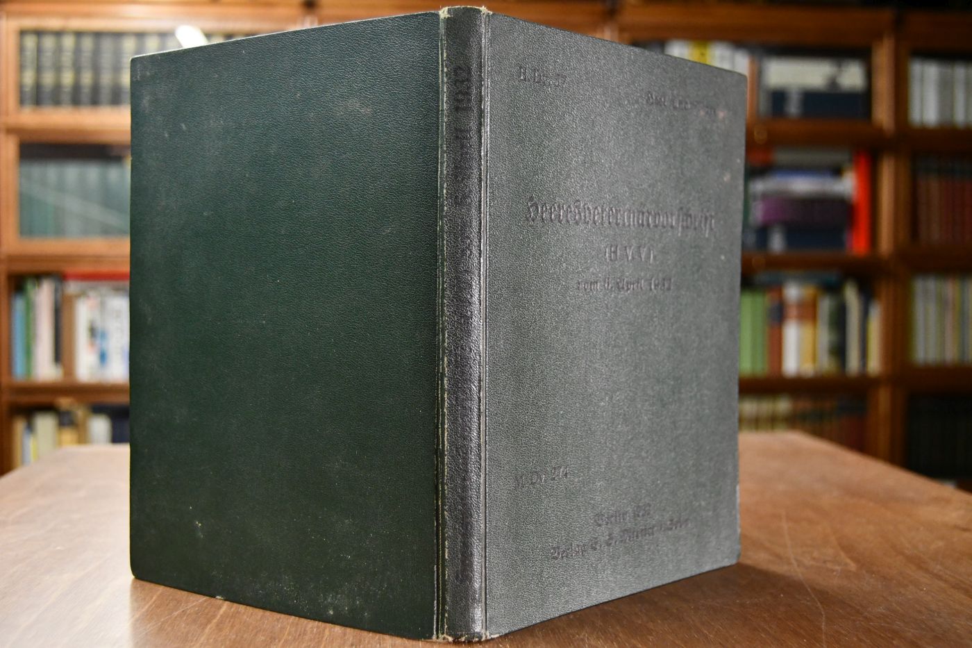 Beschreibung Einband berieben, bestoßen, angeschmutzt und fleckig. Schnitt angeschmutzt und fleckig. Block vorgefallen. Bei vorgefallenen Seiten Anschmutzungen und Randeinrisse. Durchgehend fortgeschrieben, mit Marginalien, Streichungen und Einklebungen. Spuren korrodierter Heftklammern im Falz. Handschriftlicher Besitzereintrag auf fliegendem Vorsatz. Beiliegend: Merkblatt: Die Veterinärdienste des Feldheeres, 12 S., Berlin, 1938.