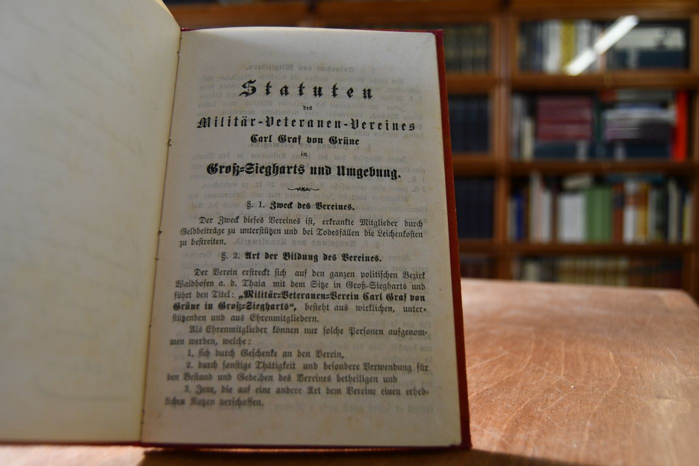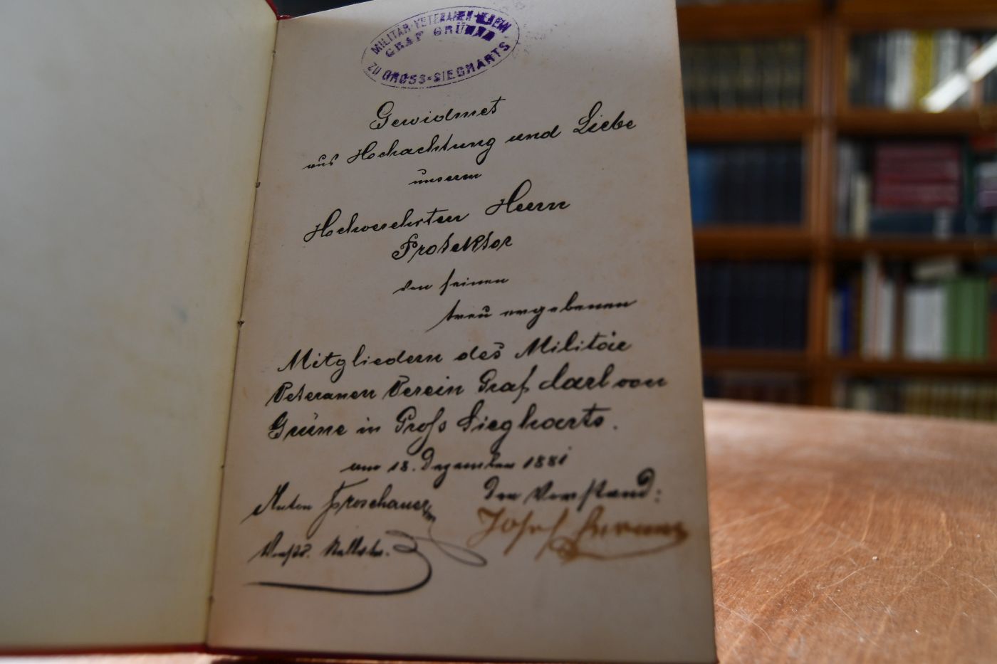 Beschreibung Einband berieben, bestoßen und fleckig. Auf fliegendem Vorsatz mit einer handschriftlichen Widmung von Josef Ferner (Vorstand) und Anton Froschauer (Stellvertretender Vorstand) an einen namentlich nicht genannten Professor vom 18. Dezember 1881. Im Anhang an den gedruckten Text der Statuten eine 5-seitige handschriftliche Chronik des Vereins die wiederum von Anton Froschauer und Josef Ferner unterschrieben und mit dem Vereinssiegel gestempelt wurde.