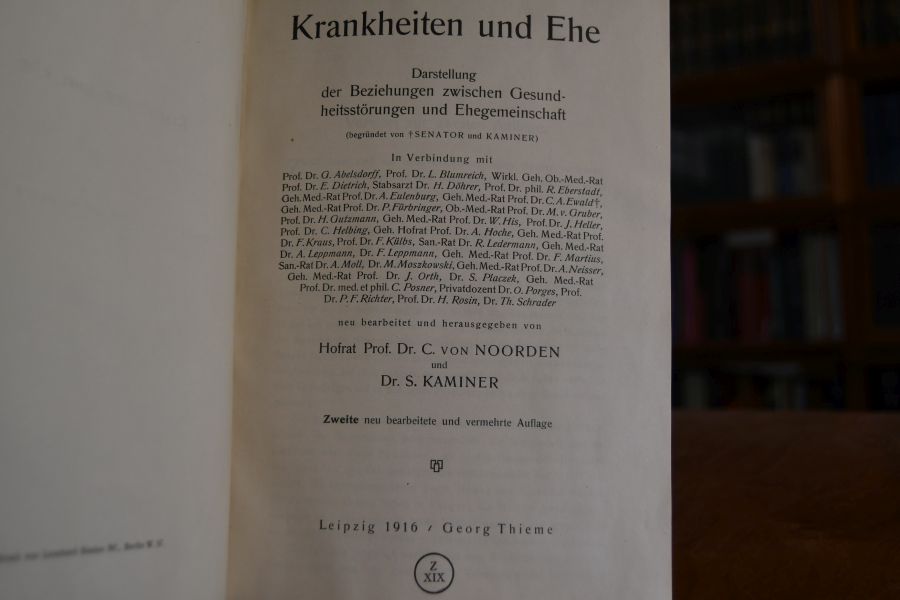 Beschreibung Einband berieben und am Rücken mit Einriss. Innen sauber. Enthält u.a.: Inhalt: M. v. Gruber: Die hygienische Bedeutung der Ehe. J. Orth: Angeborene und ererbte Krankheiten und Krankheitsanlagen. Fr. Kraus: Blutsverwandtschaft in der Ehe und deren Folgen für die Nachkommenschaft. Fr. Martius: Der Familienbegriff und die genealogische Vererbungslehre. M. Moszkowski: Klima, Rasse und Nationalität in ihrer Bedeutung für die Ehe. P. Fürbringer: Sexuelle Hygiene in der Ehe. Th. Schrader: Menstruation, Schwangreschaft, Wochenbett und Laktation in ihren Beziehungen zur Ehe. C. v. Noorden: Stoffwechselkrankheiten und Ehe. O. Porges: Erkrankungen der endokrinen Drüsen und Ehe. H. Rosin: Blutkrankheiten und Ehe. W. His: Krankheiten des Gefäßapparates und Ehe. S. Kaminer: Krankheiten der Atmungsorgane und Ehe. C. A. Ewald: Krankheiten des Verdauungsapparates und Ehe. Paul Friedrich Richter: Nierenkrankheiten und Ehe. C. Helbing. Krankheiten der Knochen und Gelenke in ihren Beziehungen zur Ehe. G. Abelsdorff: Beziehung der Ehe zu Augenkrankheiten mit besonderer Rücksicht auf die Vererbung. H. Gutzmann: Die Vererbung von Sprachstörungen. R. Ledermann: Hautkrankheiten und Ehe. R. Ledermann: Syphilis und Ehe. A. Neißer: Trippererkrankung und Ehe. C. Posner: Erkrankungen der tieferen Harnwege. L. Blumenreich: Frauenkrankheiten, Empfängnisunfähigkeit und Ehe. A. Eulenburg: Nervenkrankheiten und Ehe. A. Hoche. Geisteskrankheiten und Ehe. A. Moll: Perverse Sexualempfindung, psychische Impotenz und Ehe. A. Leppmann: Alkoholismus, Morphinismus und Ehe. F. Leppmann: Gewerbliche Schädlichkeiten und Ehe. Julius Heller: Krankheit und Ehetrennung. S. Plazek: Ärztliches Berufsgeheimnis und Ehe. Rudolf Eberstadt: Die sozialpolitische Bedeutung der sanitären Verhältnisse in der Ehe.