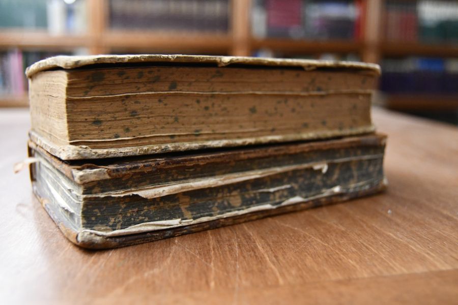 Format 18 x 11 cm, Bd. 1: Leder mit 5 Bünden, 2 Rückenschilden, etwas Rückenvergoldung und umlaufendem marmorierten Schnitt. Bd. 2: Halbleder mikt Rückenschild