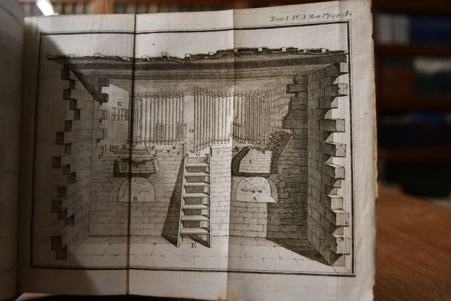Beschreibung Bd. 1: Tafel 4 mit etwas Randverust. Tafel 5 mit deutlichem Eckabriss. Tafel 7 mit etwas Verlust (in der Abb.) am rechten Rand. Tafel 8 mit Eckabriss (mit Verlust in der Abb.). Tafel 9 fehlt zu 2/3. Bd. 2: Tafel 5 mit fast durchgehendem Einriss. Einband berieben, bestoßen, mit Einrissen und Verlust der Oberfläche, besonders am Rücken. Rückenschilde mit Verlust. Fliegendes Vorsatz fehlt. Stiche in Bd. 1 verfaltet und mit deutlichem Verlust. Immer wieder etwas fleckig. Gutes Leseexemplar.