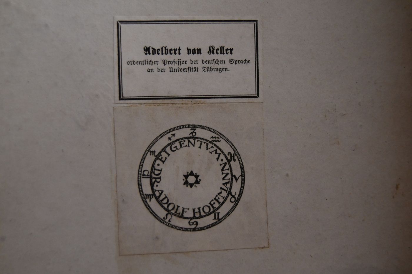 Beschreibung Einband berieben, bestoßen und am Rücken mit späterer Papierklebebandverstärkung. Durchgehend fleckig. Auf Innendeckel Exlibris von Prof. Adelbert von Keller und ein weiteres von Dr. Adolf Hoffmann, ebenso ein Monogrammstempel (GW).