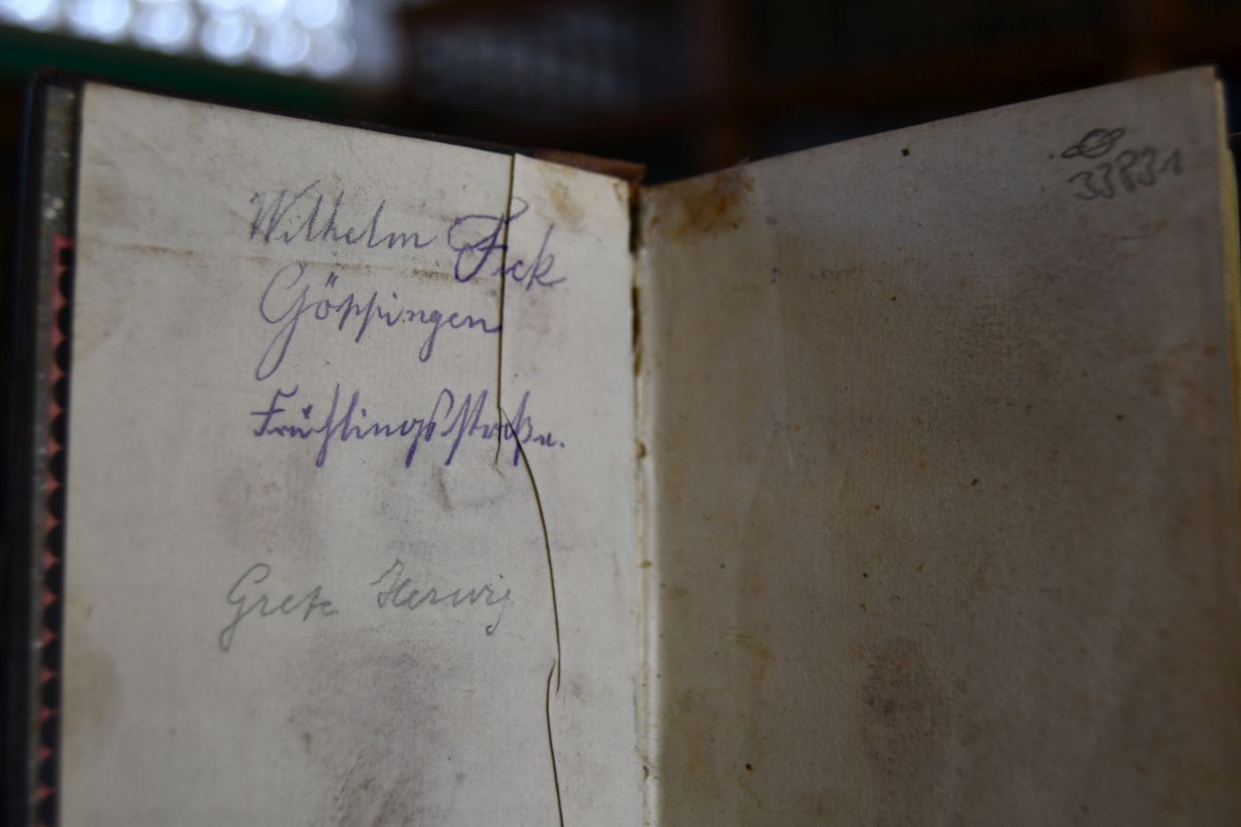 Beschreibung Einband berieben und bestoßen. Lederrücken ergänzt. Rückenschild fehlt teilweise. Bibliotheksexemplar (Männer Turngemeinde Göppingen) mit den üblichen Stempeln und Eintragungen. Daneben private Besitzereinträge (C. Conz, Wilhelm Frick, Grete Herwig, Herwig) auf den Vorsätzen. Immer wieder etwas fleckig.