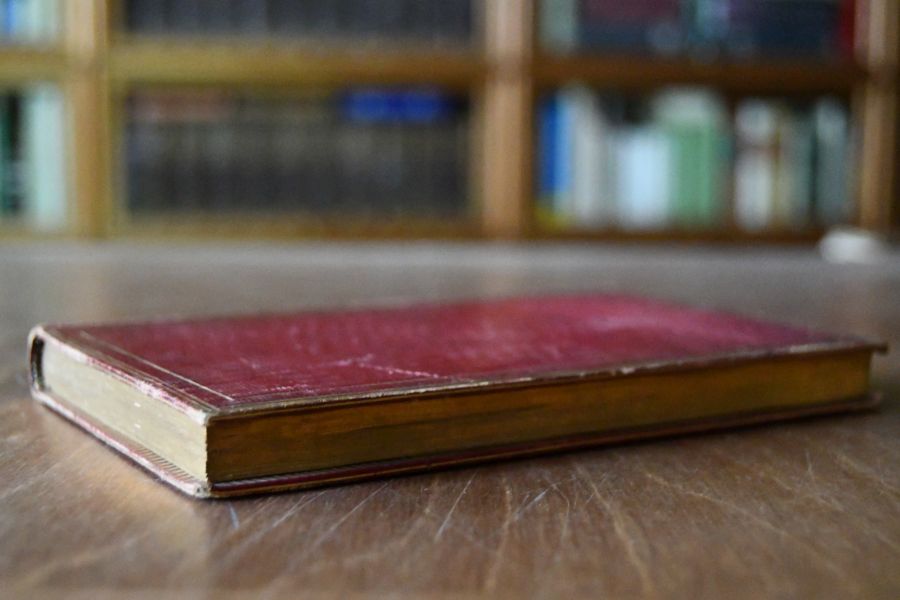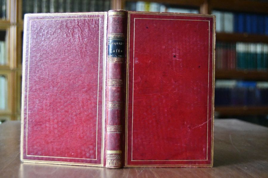 Format 17 x 11 cm, Leder mit Rückenschild (teilweise Verlust), umlaufendem Goldschnitt und Stegrandvergoldung