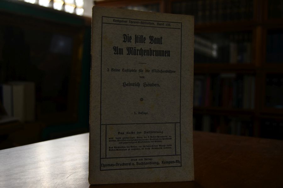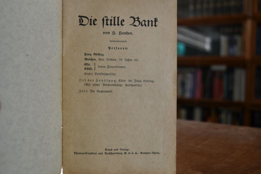 Beschreibung Einband berieben und bestoßen. Innen sauber. "Heinrich Houben (* 19. Februar 1866 in Leutherheide; † 20. Juli 1941 daselbst) war ein deutscher Schriftsteller und Dichter. Heinrich Houben war der Sohn des Volksschullehrers Johann Wilhelm Houben(1832–1899) und seiner Ehefrau Helene Simon (1836–1923). Nach dem Besuch der von seinem Vater geleiteten Volksschule besuchte er zur Zeit des Kulturkampfs das Dominikaner-Collegium im niederländischen Venlo, später das Gymnasium Thomaeum in Kempen. 1882 wurde er auf der Landstraße zwischen Breyell und Lobberich Opfer eines Überfalls, bei dem er so schwer verletzt wurde, dass er das Gymnasium verlassen musste und die angestrebte Lehrerausbildung nicht weiterverfolgen konnte. Autodidaktisch bildete er sich insbesondere in Literatur, Kunst, Theologie, Geschichte sowie Fremdsprachen weiter, so dass er selbst viele seiner Theaterstücke ins Niederländische, Englische und Französische übersetzen konnte. Das Ende seiner Schullaufbahn wurde zum Beginn seiner schriftstellerischen Tätigkeit mit Gedichten und heimatkundlichen Aufsätzen. 1888 legte er eine Arbeit zum Henese Fleck vor, einer lokalen Geheimsprache fahrender Händler. 1893 wurde in seinem Geburtsort sein erstes Theaterstück Die Schauspielkandidatin aufgeführt. Sein erfolgreichstes Stück ist Wenn du noch eine Mutter hast von 1911, sein bedeutendstes Werk das Passionsspiel Jerusalem von 1926, das „einzige Passionsspiel in der Theaterliteratur, das ohne Christus-Rolle gespielt wird“. Er veröffentlichte über 40 Jahre hinweg durchschnittlich drei Theaterstücke pro Jahr, die er über mehrere Theaterverlage streute und mit denen er eine große Bühnenpräsenz erreichte. Aufführungen seiner Stücke in Deutschland sind aus Aachen, Bamberg, Bingen, Essen, Fulda, Königsberg, Koblenz, Krefeld, Münster und Stettin bekannt, im europäischen Ausland aus Amsterdam, Basel, Brüssel, London, Luxemburg, Mailand, Paris und Rom, aus dem Kaisertum Österreich, sowie aus Chicago, St. Louis und Daressalam Die Auflage seiner Stücke lag im Jahr 1928 über einer halben Million. Heinrich Houben starb 1941 unverheiratet und ohne Nachkommen. Heute ist Heinrich Houben außerhalb seiner Heimat nur noch in Fachkreisen bekannt, was in der starken Bindung seiner Stücke an die Zeit und den Zeitgeschmack begründet ist. Die Texte seiner Theaterstücke findet man fast nur noch in Universitätsbibliotheken, z. B. in Bonn, Düsseldorf, Köln und Münster, sowie im Archiv des Kreises Viersen in der Burg Kempen." (Wikipedia)
