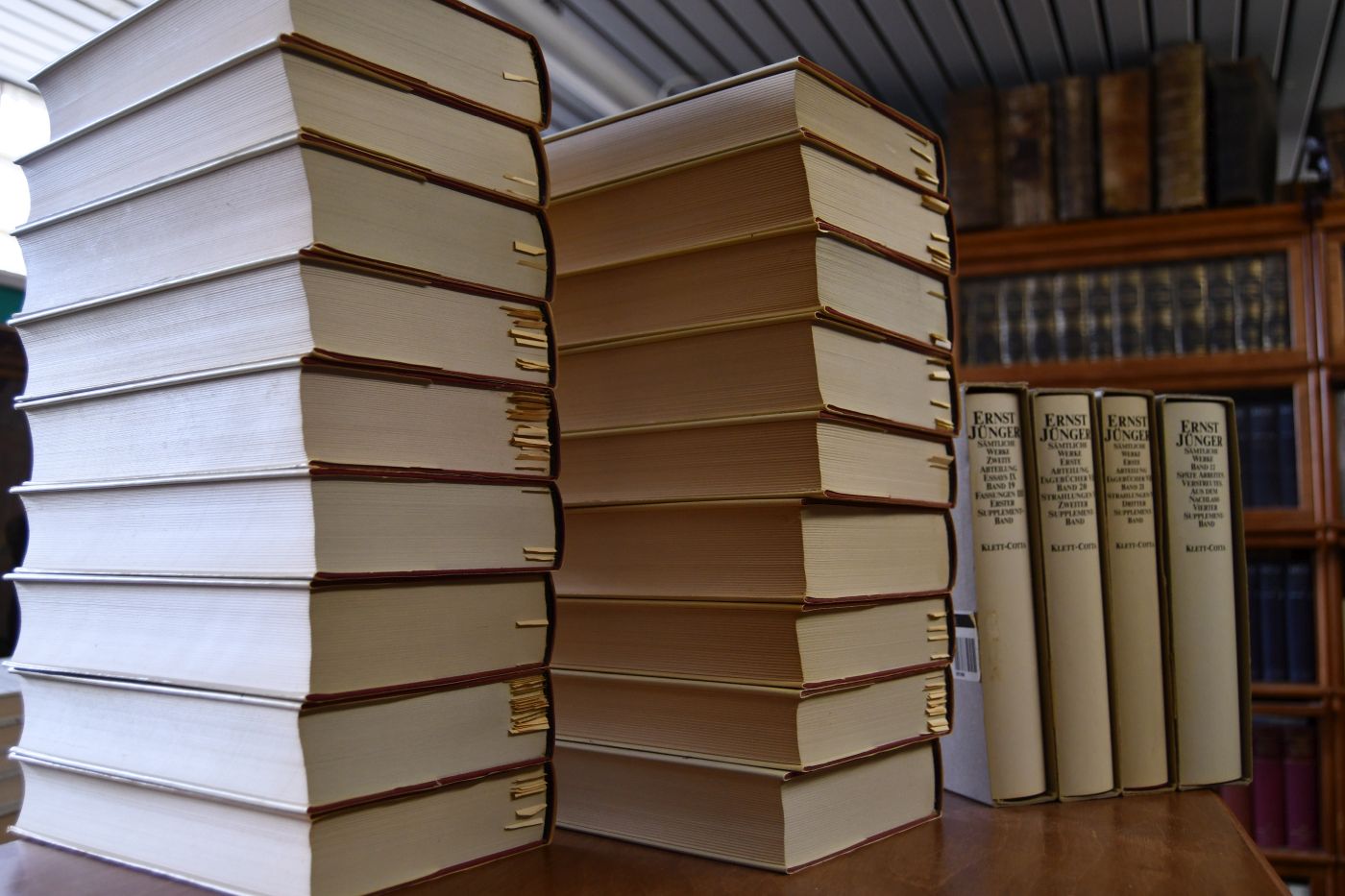 Beschreibung Schutzumschlag berieben, bestoßen, gebräunt, mit Einrissen und z.T. fleckig. Aus Raucherhaushalt. Schnitt gebräunt und teilweise fleckig. Durchgehend mit Einlegestreifen und handschriftlichen Bleistiftmarginalien und -anstreichungen von Gerd Bergfleth, der auch jeden Band mit seinem handschriftlichen Besitzereintrag versehen hat. WG II, 129.