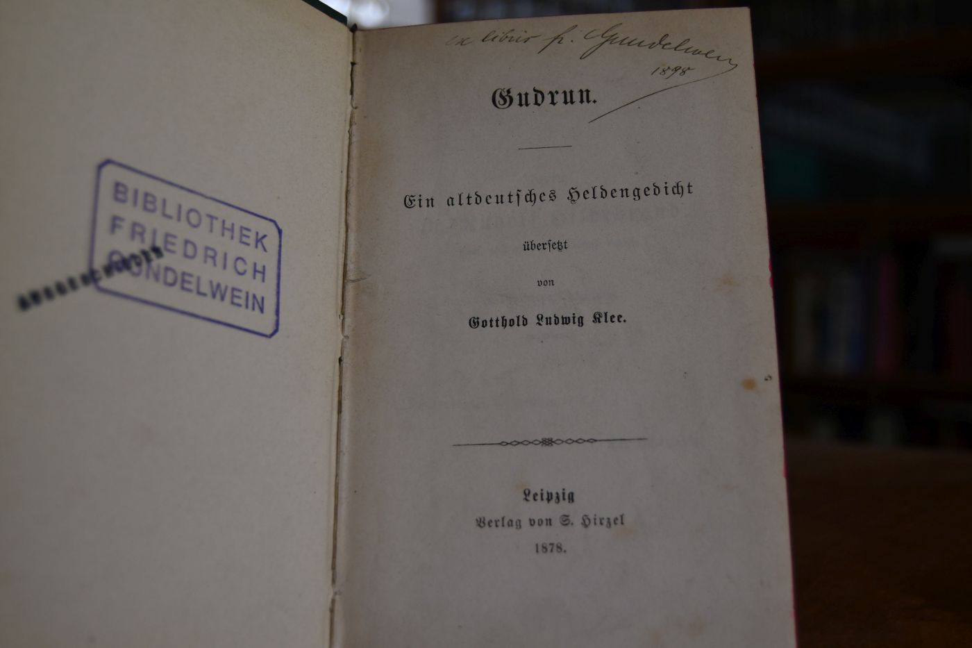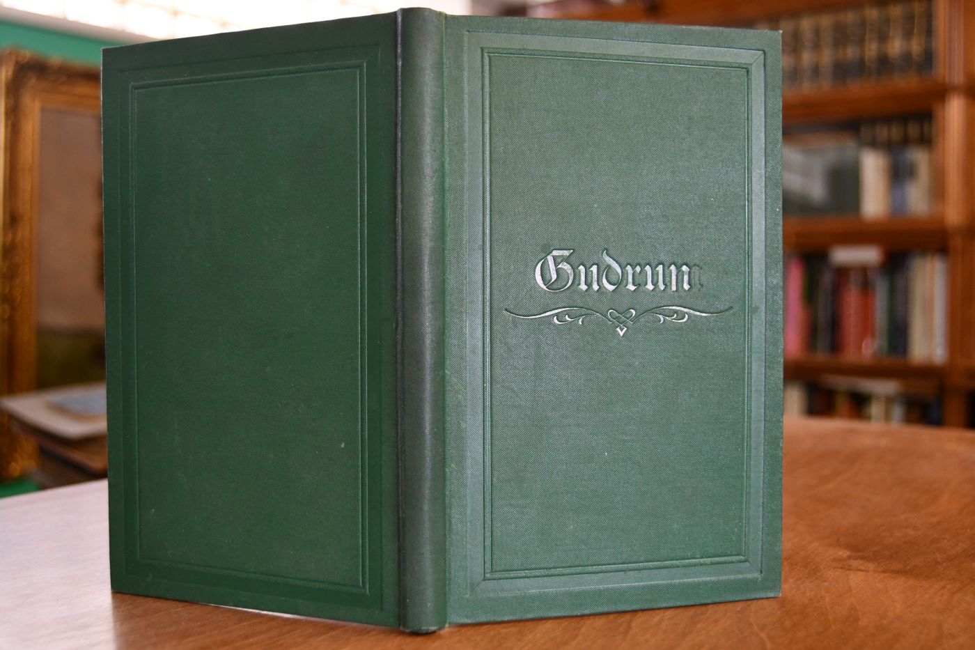 Beschreibung Einband berieben und auf der Rückseite etwas blasig. Besitzerstempel auf fliegendem Vorsatz und handschriftlicher Besitzereintrag (Friedrich Gundelwein) auf Titel. Dass der Buchbinder statt "Gudrun" "Gudrum" auf den Vorderdeckel geprägt hat wurde durch die (zwischenzeitlich fast nicht mehr vorhandene) Vergoldung zu retten versucht.