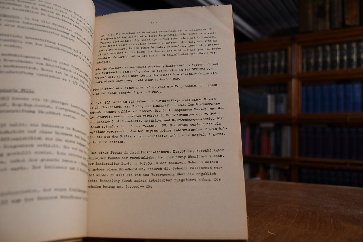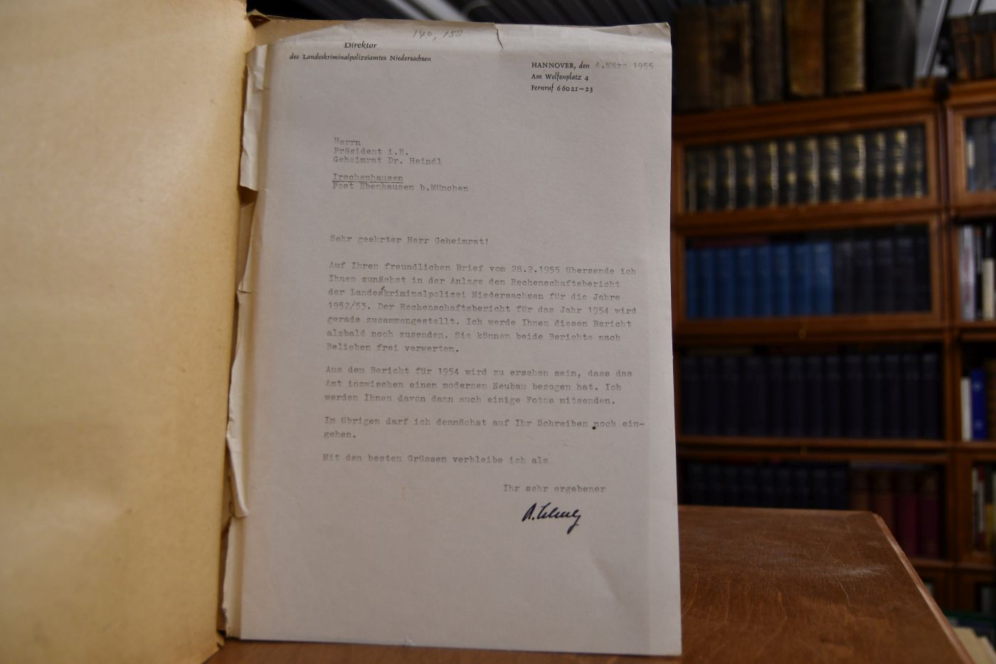 Beschreibung Einband berieben, bestoßen, angeschmutzt und mit Einrissen. Papierbedingt gebräunt. Beiliegend ein Brief des Direktors des Landeskriminalpolizeiamtes Georg Schulz an Präsident i.R. Geheimrat Dr. Heindl vom 4. März 1955. Dieser Brief ist am Rand angeschmutzt und hat stärkere Einrisse.