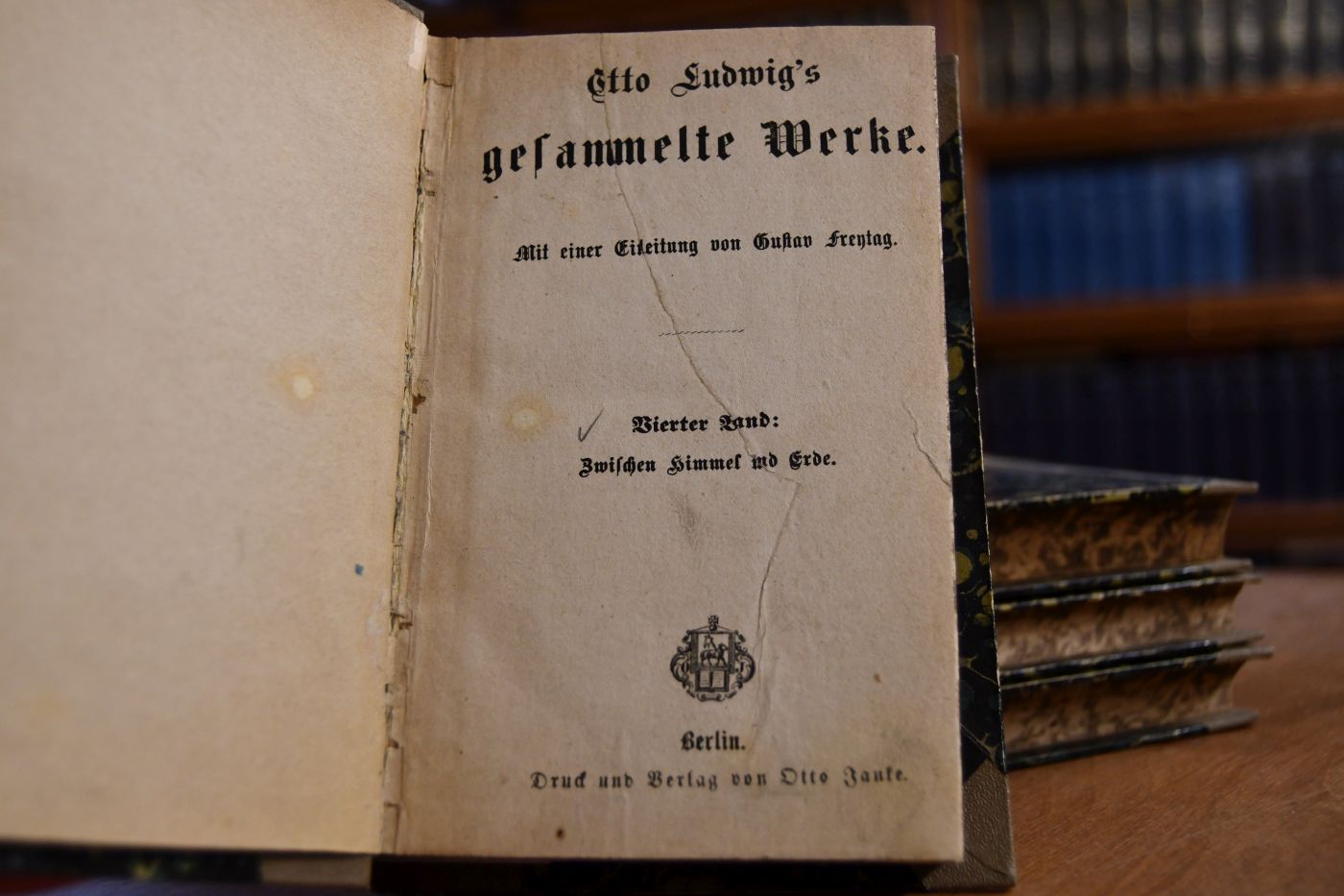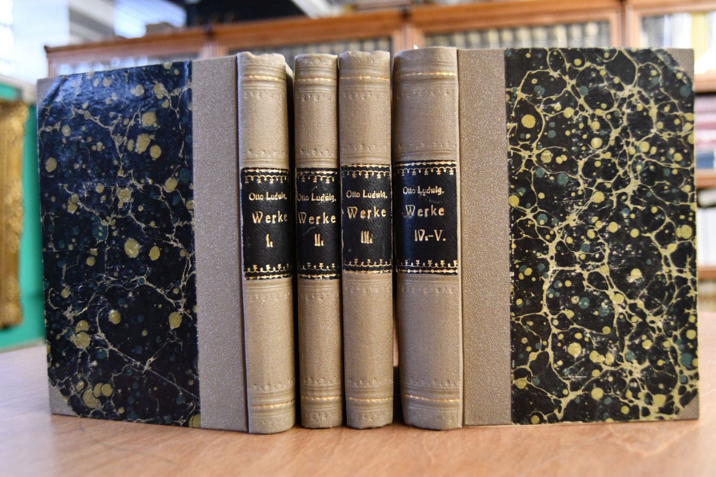 Beschreibung Einband berieben. Mit Besitzerstempel (P. Rockenstein, Leihbibliothek, Wien, Singer-Str. 3) auf Titel. Papierbedingt gebräunt. Manchmal etwas knapp beschnitten. Erste Gesamtausgabe der Werke Otto Ludwigs mit einigen Erstveröffentlichungen aus dem Nachlaß. 1-2: Dramen (Der Erbförster. Das Fräulein von Scudery. Die Makkabäer. Die Torgauer Heide. Der Engel von Augsburg. Tiberius Cracchus.- Gedichte). 3. Die Heiterethei und ihr Widerspiel (d.i. Aus dem Regen in die Traufe). 4. Zwischen Himmel und Erde.- "Ein fünfter Band mit den Novellen "Reden oder Schweigen" und "Der Tote von St. Annas Kapelle" war bereits gedruckt, als es sich ergab, daß diese Novellen nicht dem (Thüringer) Dichter, sondern dem unter dem Pseudonym "Otto Ludwig" erzählenden Emil von Puttkamer angehörten, der sodann unter dem Namen "Otto Ludwig aus Reichenbach" geführt wurde" (Stern). Das peinliche Versehen des Herausgebers G. Freytag zwang den Verlag, den fünften Band der Ausgabe kurz nach Erscheinen zurückzuziehen. Er fehlt darum fast immer, ist aber hier vorhanden(!).