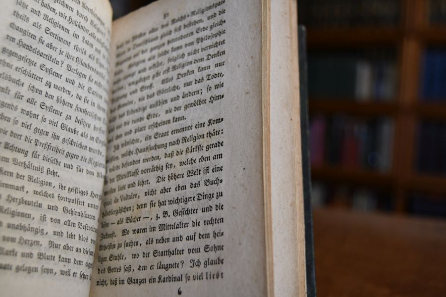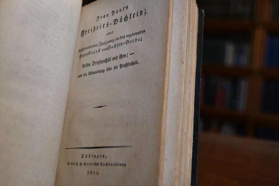 Mars und Phöbus. Thronwechsel im J. 1814; eine scherzhafte Flugschrift. Beigebunden Freiheits-Büchlein oder dessen verbotene Zueignung an den regierenden Herzog August von Sachsen-Gotha; dessen Briefwechsel mit ihm; und die Abhandlung über die Preßfreiheit. Tübingen, Cotta, 1805, 138 (recte 128) S.