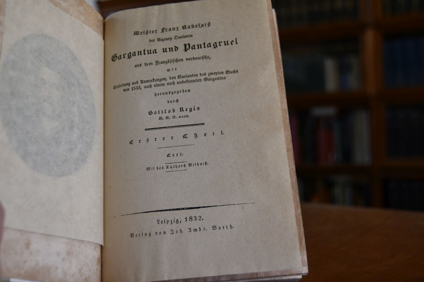 Meister Franz Rabelais der Arzeney Doctoren Gargantua und Pantagruel aus dem Französischen verdeutscht, mit Einleitung und Anmerkungen, den Varianten des zweyten Buchs von 1533, auch einem noch unbekannten Gargantua herausgegeben durch Gottlob Regis. Erster Theil (von 2) apart.