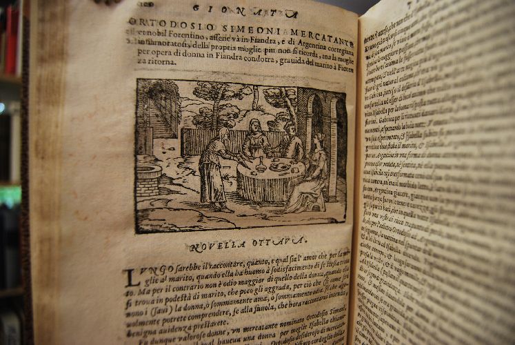 Beschreibung Einband berieben und bestoßen. Schnitt etwas fleckig und angeschmutzt. Neuer Halbledereinband. Handschriftlicher Besitzereintrag in Bleistift auf Titel. Auf Inhaltsverzeichnis einige schwache Farbstifteintragungen. Papier wellig. Einige Seiten fleckig und wasserrandig. Holzstiche meist etwas schwach abgedruckt. Jede Novelle mit einem Textholzschnitt und einer Schmuckinitiale sowie zu Beginn einem ganzseitigen Holzschnitt. Text auf italienisch.