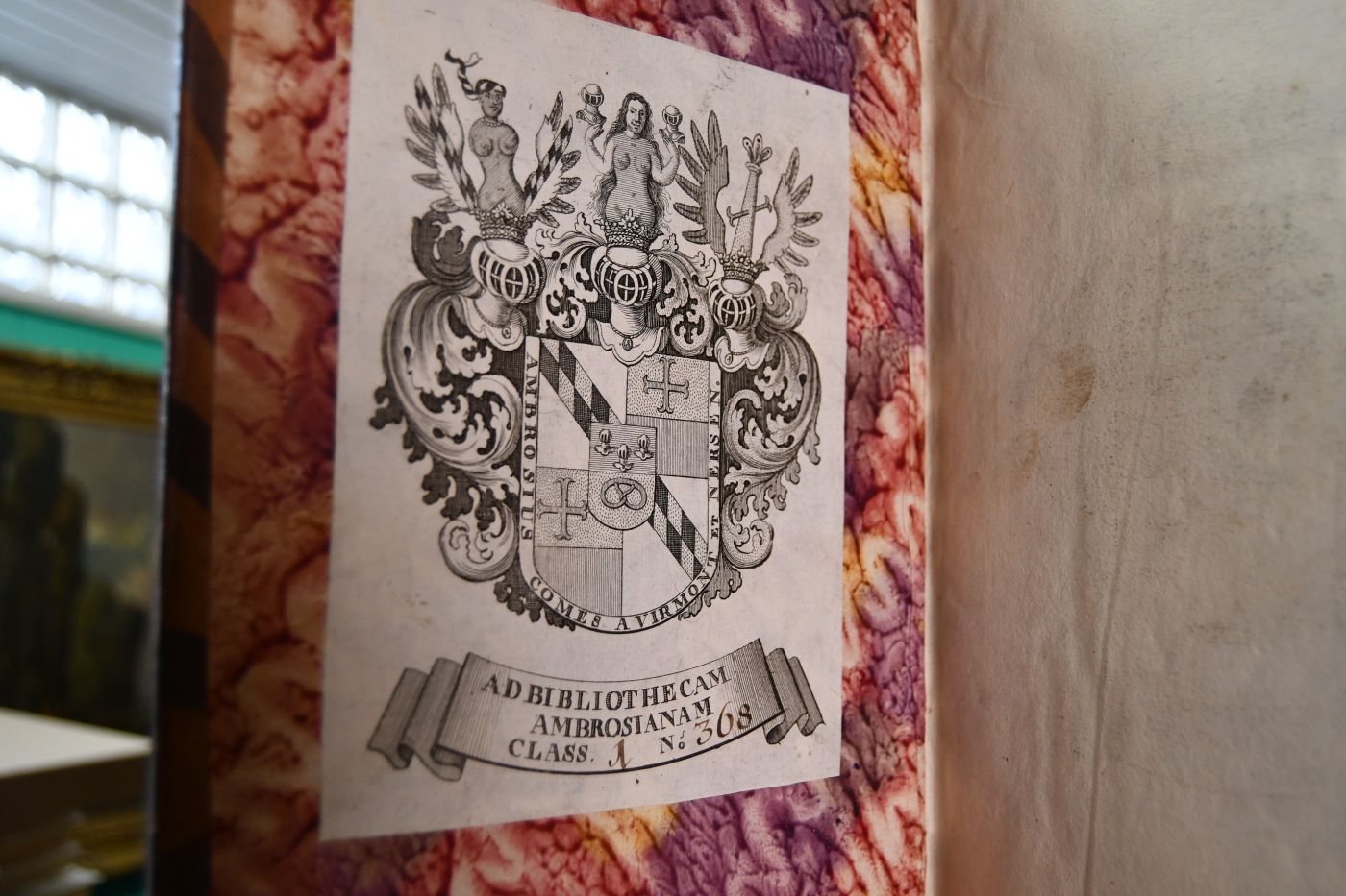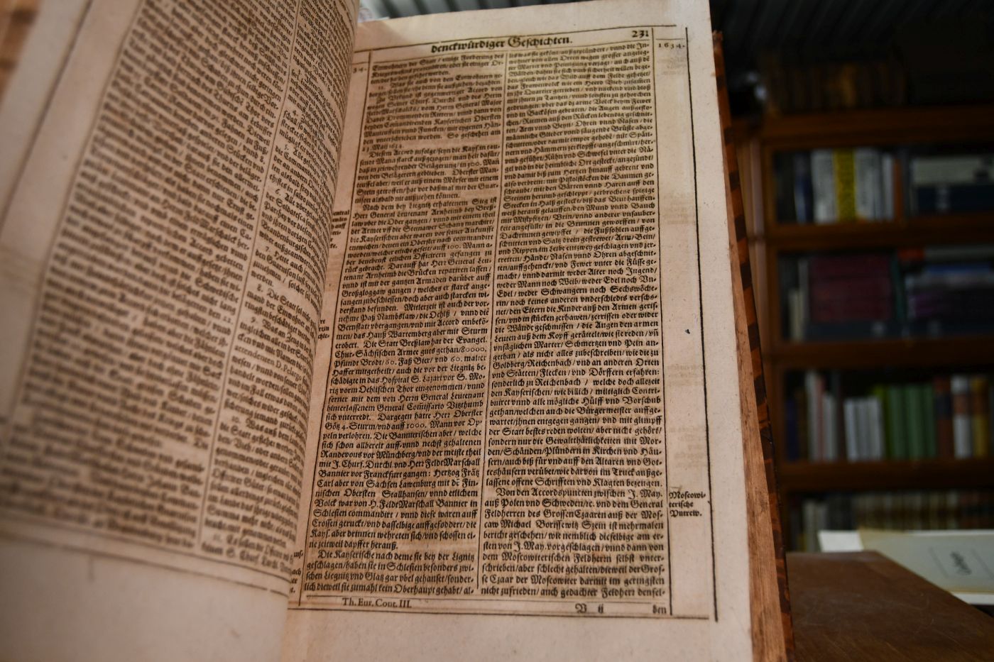Beschreibung Einband berieben und bestoßen. Deckel mit Wurmspuren.Titelblatt mit Mäusefraß und Fehlstelle. Druckspiegel gebräunt. Dritter Teil der Fortsetzung von J. P. Abelins "Historischer Cronik" (das Grundwerk reichte nur bis 1619). "Schon Merian trug dem Verfasser auf, jenen ersten Band bis an die Gegenwart fortzuführen. Von dieser Fortsetzung erschien zuerst 1633 der 2. Theil, die Jahre 1629-33 umfassend [...] 1635 folgte der erste Band nach, die Jahre 1619-29 umfassend, mit dem hier zuerst gebrauchten Titel `Theatrum Europaeum` [...] Im Lauf der Jahre folgten dann noch 19 weitere Bände, das `Theatrum` bis 1738 fortführend" (ADB I, 18f.). Den vorliegenden Band besorgte der hessische Theologe und gelehrte Schulmeister H. Oraeus (1584-1646). Mit folgenden Porträtkupfern:General Johann Altringer, General Johann Georg von Arnheim, Vladislaus IV König in Polen, Graf Thomas Howard von Arundel Englischer Botschafter, Axel Oxenstern schwedischer Kanzler, Pfalzgraf Christian zu Birkenfeld, Markgraf Friderich zu Baden, Kardinal Ferdinand Infant zu Spanien, Rheingraf Ott Ludwig, Karl Herzog zu Lothringen, Maximilian Landgraf zu Stülingen, Gaston von Frankreich, Thomas Franz Herzog in Savoyen, Gustav Horn, Graf Ludwig Heinrich zu Nassau Dillenberg,Jean de S. Bonnet, Herr von Toyras, D. Anthonius Wolff a Todenwart Hessen-Darmstattischer Cantzler, Pfalzgraf Carl Ludwig Kurprinz, Thomas Parr 150 Jar alt, Henrich Burggraf zu Dona, Herzog Eberhard zu Württemberg, Philipp IV. König in Hispanien, Generalfeldmarschall Dodo von Inhaussen und Knipphaussen, Henricus de Rohan Prinz von Leon, Johann Baron de Werth Generalfeldmarschall, Christoff Artiszewsky Generalleutnant in Brasilien, Markgraf Wilhelm zu Baden, Graf Moritz von Nassau General in Brasilien, General Johann Banner, Kaiser Ferdinand der Dritte, Kaiser Ferdinan der Zweite, Charles de Crecquuy Marschall von Frankreich, Generalmajor Jacob Ramsay, Herzog Bernhard zu Sachsen Weimar, Generalleutnant Matthias Graf von Gallas, Obrist Reinhold von Rosen, Baron de Bassompiere.