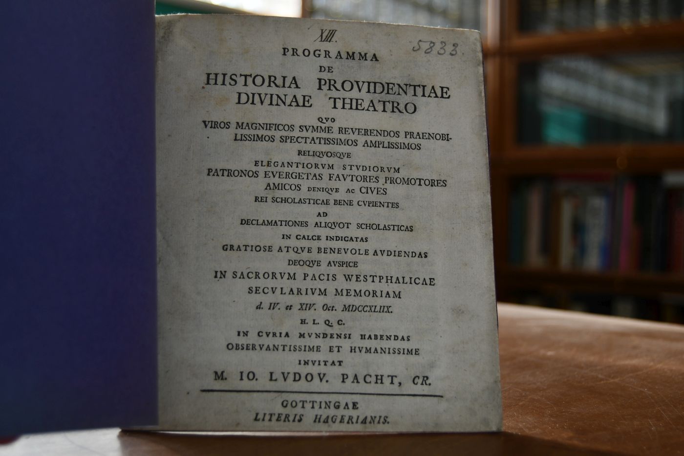 Programma de Historia providentiae Divinae Theatro quo viros magnificos summe reverendos praenobilissimos spectatissimos amplissimos reliquosque elegantiorum studiorum patronos evergetas fautores promotores amicos denique ac cives rei scholasticae bene cupientes ad declamationes aliquot scholasticas in calce indicatas gratiose atque benevole avdiendas deoque auspice in sacrorum Pacis Westphalicae secularium memoriam d. IV. et XIV. Oct. MDCCXLIIX. H.L.Q.C. In curia mundensi habendas observantissime et humanissime invitat.