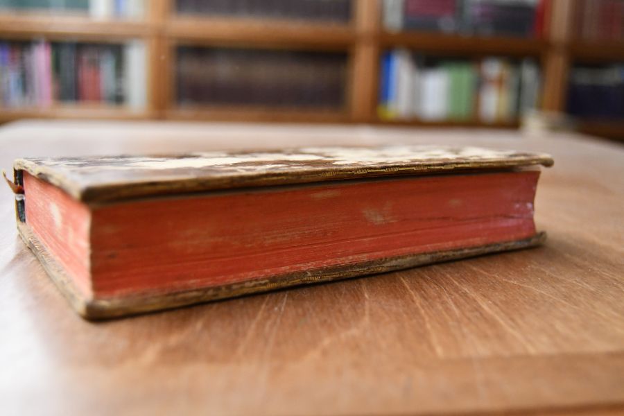 Format 17 x 11 cm, Leder mit 5 Bünden, Rückenschild, Rücken- und Stegrandvergoldung und umlaufendem Rotschnitt. Rückdeckel mit 5-Cent-großer Fehlstelle.