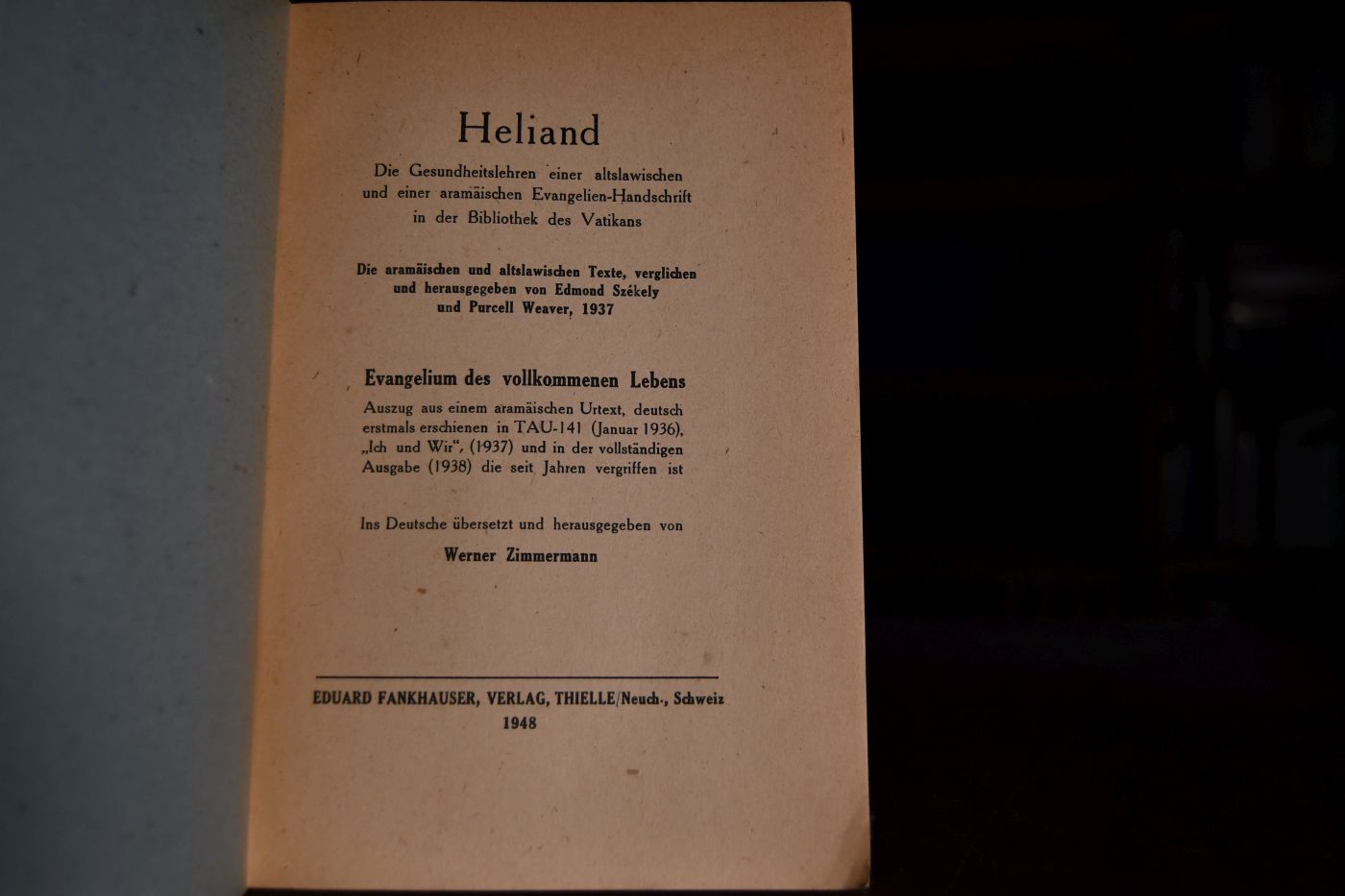 Heliand. Die Gesundheitslehren einer altslawischen und einer aramäischen Evangelien-Handschrift in der Bibliothek des Vatikans. Die aramäischen und altslawischen Texte verglichen und herausgegeben von Edmond Székely und Purcel Weaver 1937. Evangelium des vollkommenen Lebens. Auszug aus einem aramäischen Urtext, deutsch erstmals erschienen in TAU-114 (Jan. 1936). Ins Deutsche übersetzt und herausgegeben von Werner Zimmermann.