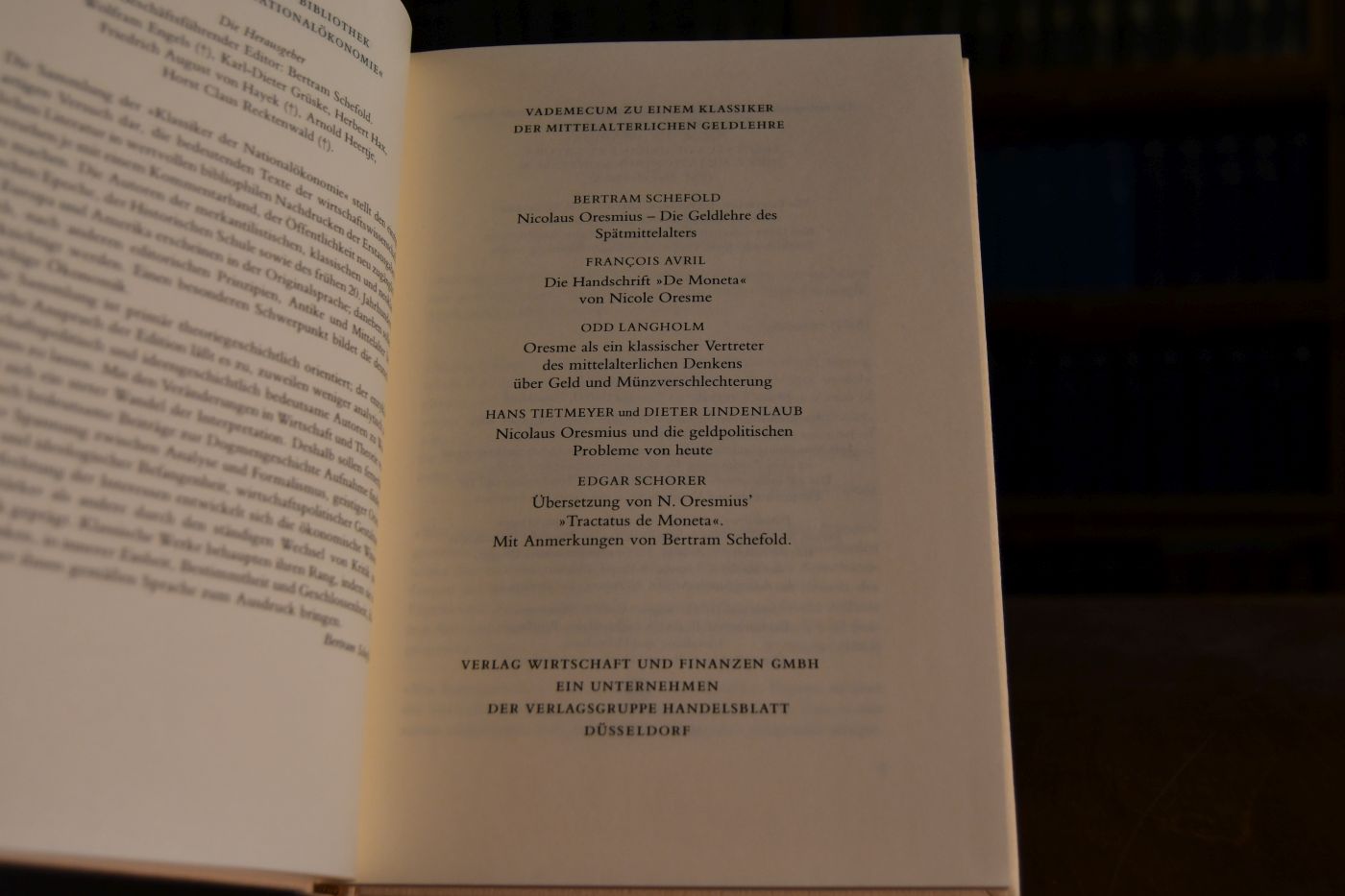 Beschreibung Verlagsfrisch. »Den Oresmius können wir in doppelter Hinsicht als den größten scholastischen Volkswirth bezeichnen: einmal wegen der Wahrheit seiner Ansichten, dann aber auch, weil er sich von der pseudotheologischen Systematik ... ebenso früh wie gründlich frei gemacht hat « (Wilhelm Roscher). Nicolaus Oresmius (um 1325 - 1382), Bischof von Lisieux, diente als Privatlehrer des Dauphin und enger Vertrauter des späteren Königs Charles V. Kirche und Staat; seine wissenschaftlichen Arbeiten in Mathematik, Physik und Astronomie gelten als herausragende Leistungen; in königlichem Auftrag übersetzte er die Werke des Aristoteles ins Französische. Der Traktat über Geld und Geldentwertung dieses »bedeutendsten Nationalökonomen des 14. Jahrhunderts« ist zwischen 1355 und 1358 entstanden, um 1361 übersetzte Oresmius den Text auch ins Französische. Veranlaßt durch die instabile Währung ist der Traktat das erste Werk, das speziell diesem Thema gewidmet ist. Oresmius behandelt die Geldlehre, den Zweck des Geldes, die Möglichkeiten der Geldabwertung, plädiert für ein flexibles Wertverhältnis zwischen Gold und Silber in Abbängigkeit von Metallförderung und Handelsbilanz und beschreibt die Auswirkungen der Geldentwertung auf Wirtschaft, Politik, Moral und Religion. Das handgeschriebene Original der faksimilierten Ausgabe stammt aus der Bibliothèque Nationale de France. Es ist um 1485 entstanden und ging dann in die Bibliothek der französischen Könige über, in deren Inventar es seit 1518 geführt wurde.