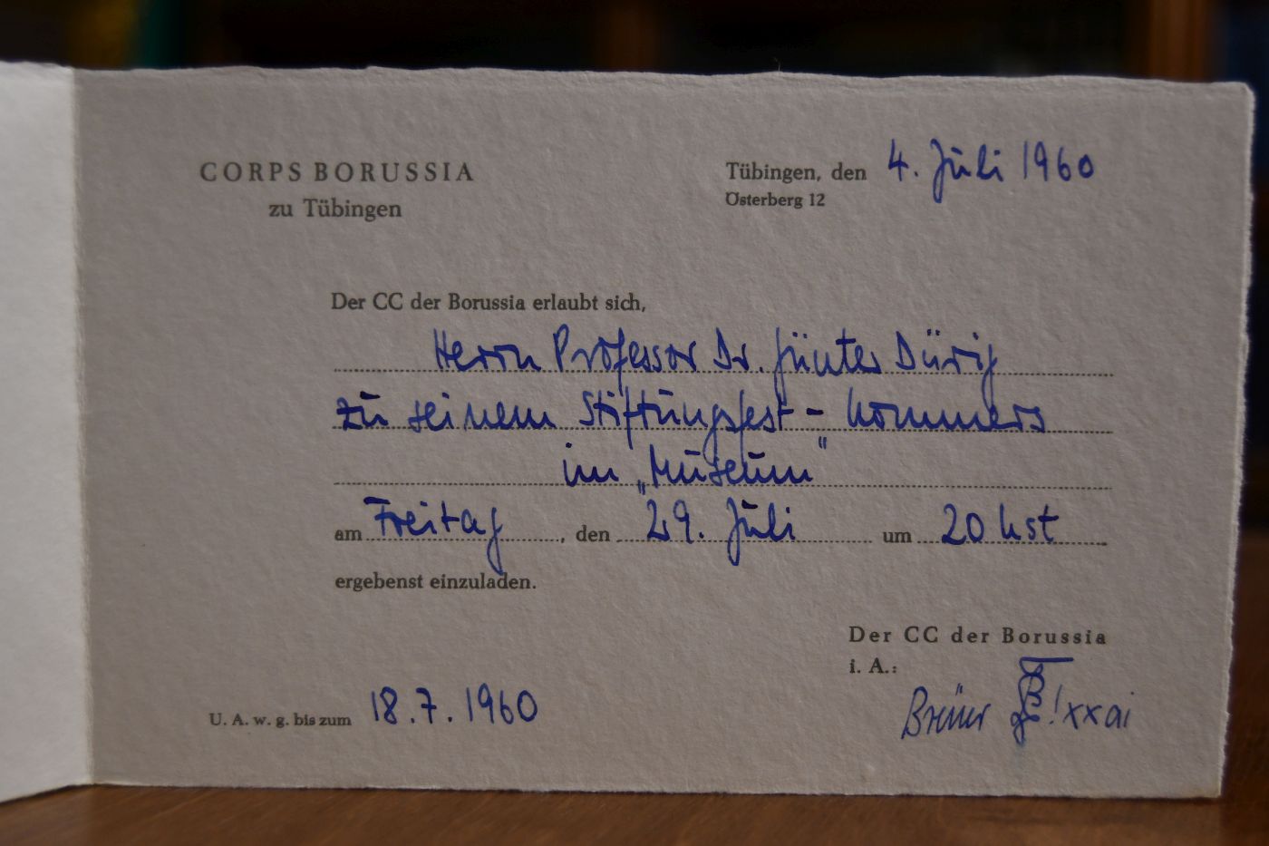 Einladungskarte des Corps Borussia zu Tübingen an Professor Dr. Günter Dürig zur Terilnahme am Stiftngsfest-Kommers im Museum am 29. Juli 1960.