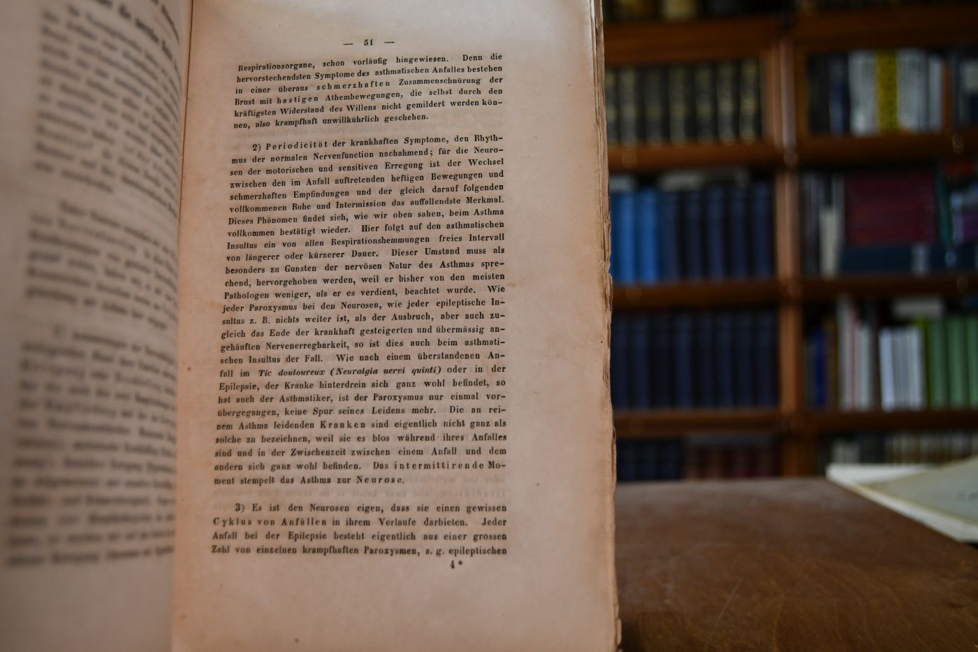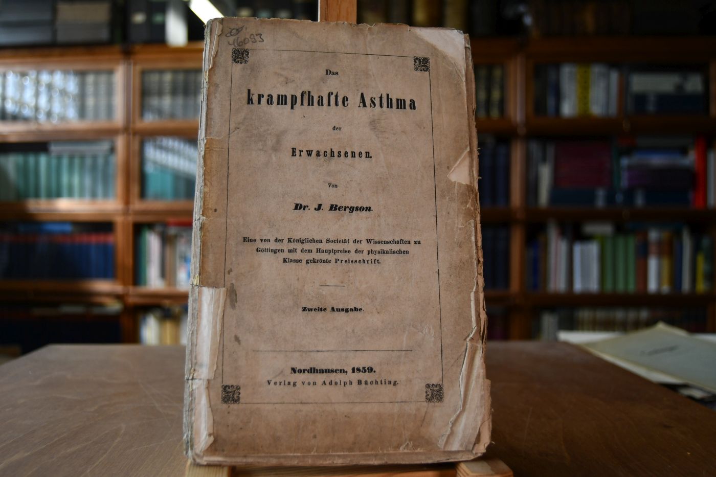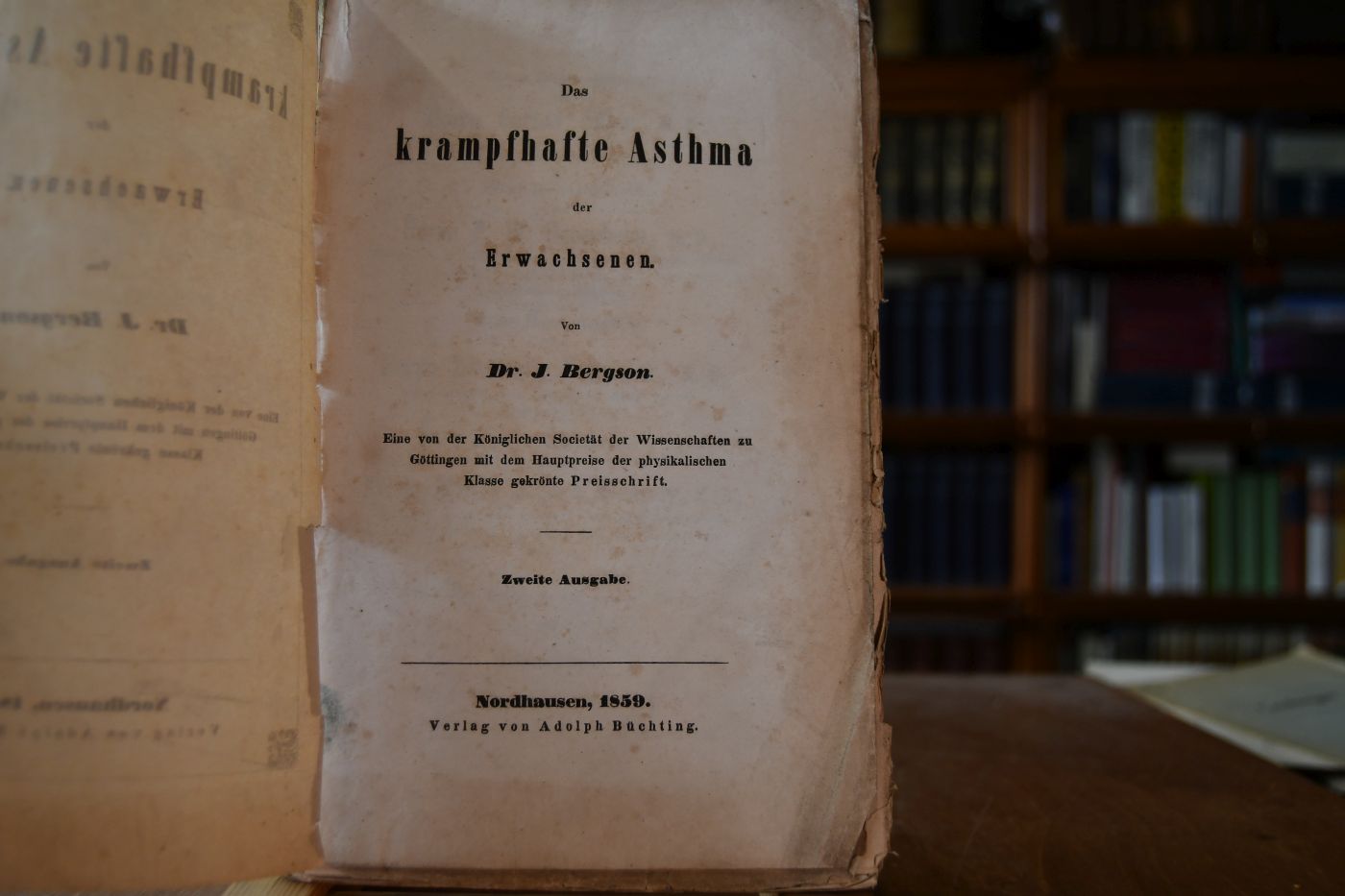 Beschreibung Einband berieben, bestoßen, quetschfaltig, fleckig, mit Einrissen und Verlust. Durchgehend fleckig und mit Randeinrissen. Behandelt die Geschichte, Natur und Diagnose der Asthmaerkrankung. Unter den sechs zum Thema eingereichten "Concurrenzschriften" verdient Bergsons Arbeit `nicht blos in historischer und literarischer Hinsicht wegen genauerer Kenntniss und Benutzung alter und neuer diesen Gegenstand betreffender Schriften, sondern auch wegen der gründlicheren und weniger einseitigen Darstellung der wichtigsten Punkte den Vorzug.`