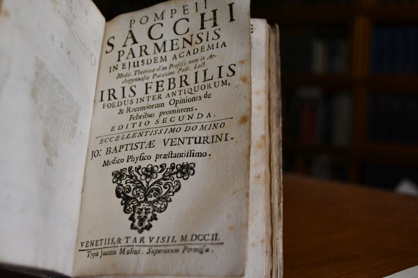 Pompeii Sacchi Parmensis in eiusdem Academia medicinae theoricae professoris Nova methodus febris curandi. Fundamentis alkali & acidi superstructa . Beigebunden Pompeo Sacco Iris febrilis foedus inter antiquorum, & Recentiorum Opiniones de Febribus promittens. Editio secunda, Venedig, Molini, 1702, 6 Bll., S. 127-385.