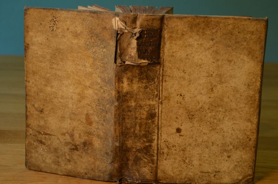 Beschreibung Pergament stärker angeschmutzt, Rückenschild zur Hälfte abgerissen und Pergamentfehlstellen im Zusammenhang damit. Hinterer Falz öffnet sich. Durchgehend gebräunt, fleckig und feuchtigkeitsrandig.