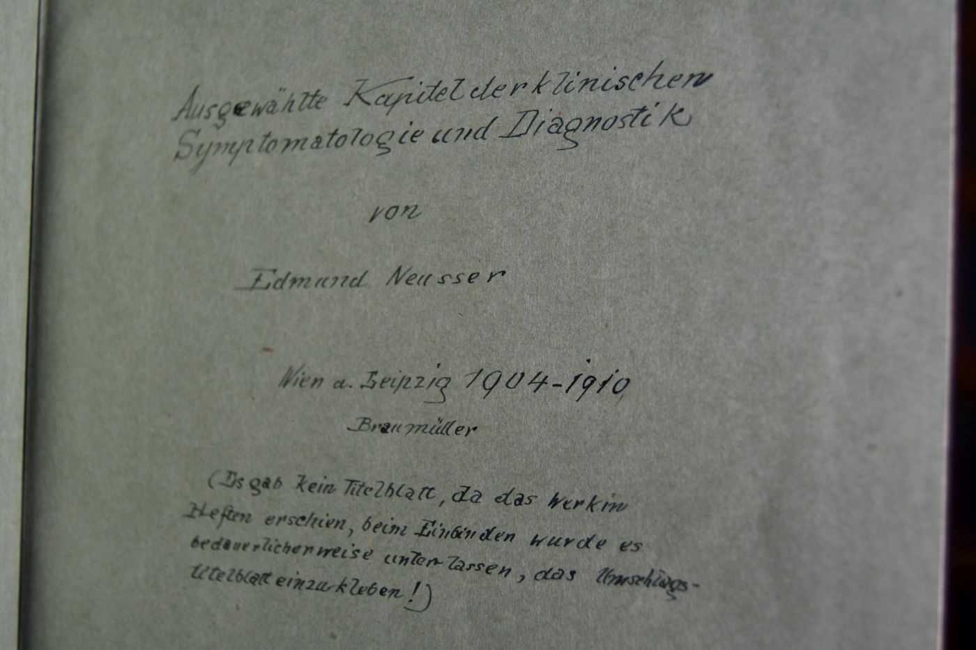 Beschreibung Einband berieben und bestoßen. Ohne Titelblatt. MIt handschriftlichem Titel auf fliegendem Vorsatz. "Edmund Neusser, seit 1905 Edmund von Neusser, (* 1. Dezember 1852 in Swoszowice bei Krakau; † 30. Juli 1912 in Bad Fischau, Niederösterreich) war ein österreichischer Internist. Edmund Neusser studierte Medizin an den Universitäten in Krakau und Wien, 1877 promovierte er zum Dr. med. Seine Ausbildung erhielt er bei Albert Duchek (1824–1882) und Anton Drasche (1826–1904), er war Assistent bei Heinrich von Bamberger an der II. medizinischen Universitätsklinik in Wien. Er habilitierte sich 1888 und war 1889 bis 1893 Primararzt im Krankenhaus Rudolfstiftung. Neusser beschäftigte sich mit Hämatologie, mit den Wechselwirkungen der endokrinen Drüsen, mit Konstitutionsanomalien, Kreislaufkrankheiten, der Tuberkulose und der Lues. 1905 wurde er nobilitiert. Im Jahr 1892 wurde in Wien Rudolfsheim-Fünfhaus (15. Bezirk) der Neusserplatz nach ihm benannt. Auch im Ort seiner Geburt Swoszowice (heute ein Bezirk Krakaus) befindet sich ein Sträßlein seines Namens." (Wikipedia)
