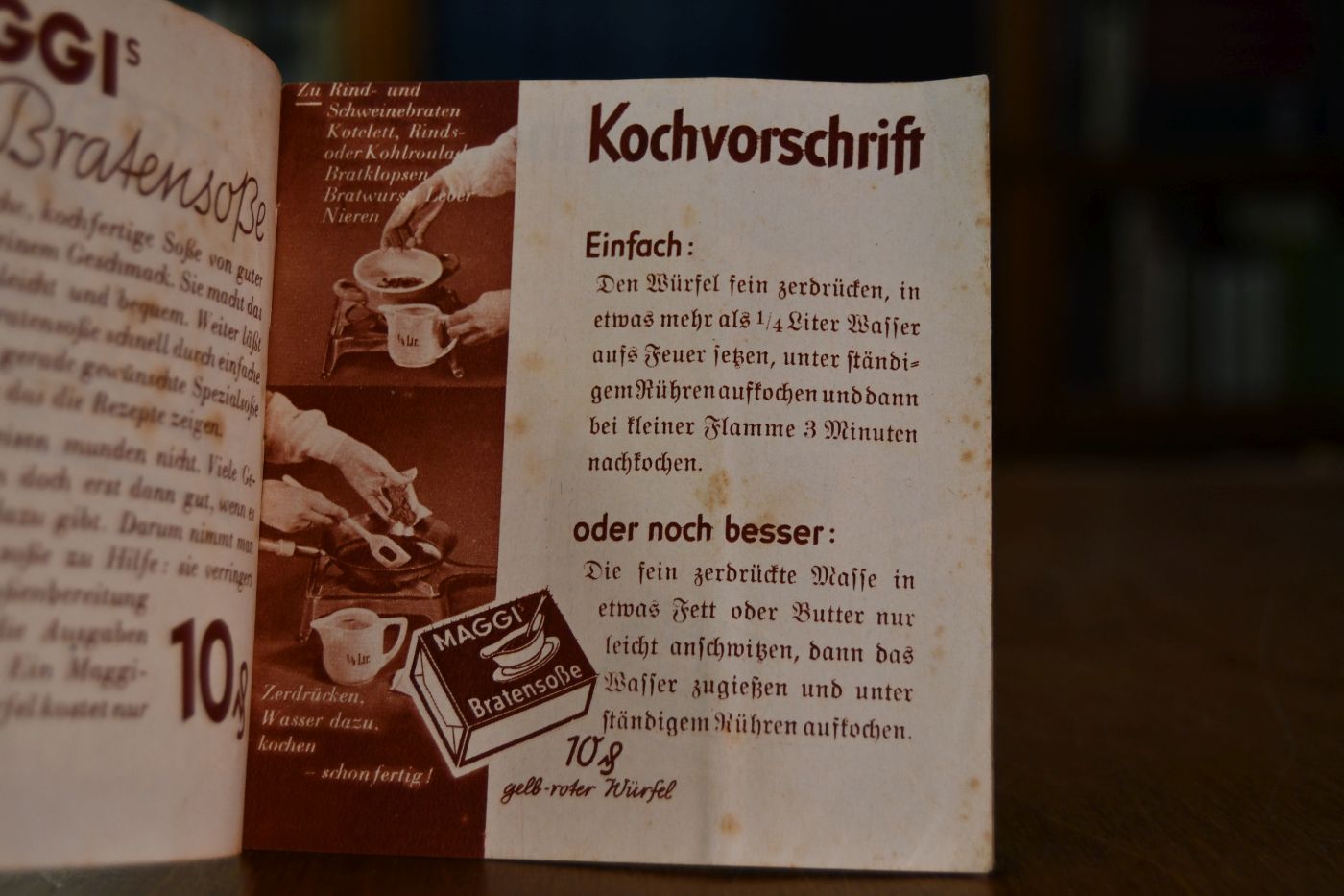 Beschreibung Rezeptsammlung für den Bratensoßenwürfel. Berieben, bestoßen und mit kleinen Einrissen. Eselsohrig. Fleckig.