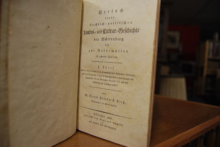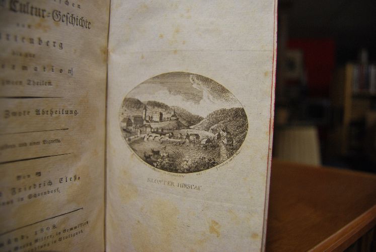 Beschreibung Einbände brieben, bestoßen und angeschmutzt. Innen durchgehend fleckig. Handschriftlicher Besitzereintrag auf Vorsatz. Gutes Leseexemplar. Mit einer gestochenen Ansicht von Kloster Hirsau (gezeichnet von C.F.Moser, gestoch. von Fr.Weber) in Oval (6 x 8,3 cm) als Frontispiz in Band II,2. Heyd I, 1939.