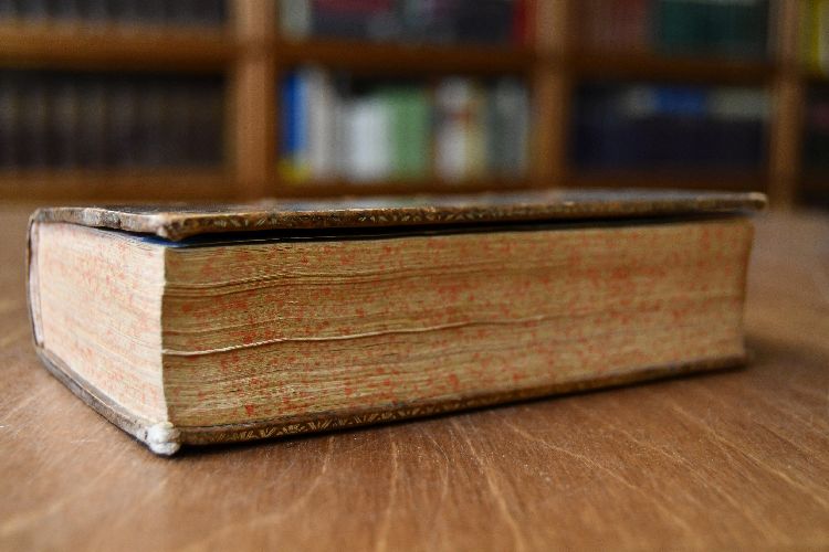 Format 17 x 10 cm, Leder der Zeit auf 5 Bünden, Stegrand- und Rückenvergoldung sowie umlaufendem Sprengschnitt
