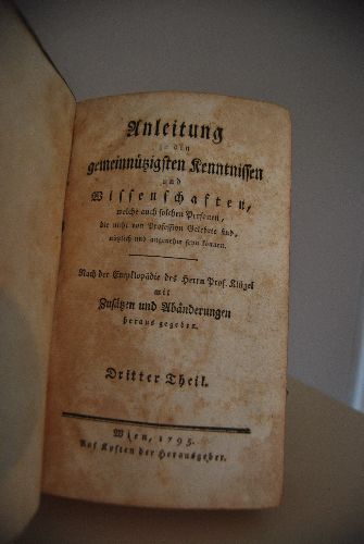 Anleitung zu den gemeinnützigsten Kenntnissen und Wissenschaften, welche auch solche Personen, die nicht von Profession Gelehrte sind, nützlich und angenehm seyn können. Nach der Encyklopädie des Herrn Prof. Klügel mit Zusätzen und Abänderungen herausgegeben. Dritter Theil (apart). Enhält V Anfangsgründe der Mathematik + VI Die Naturlehre.