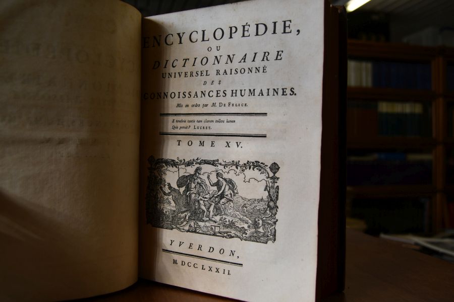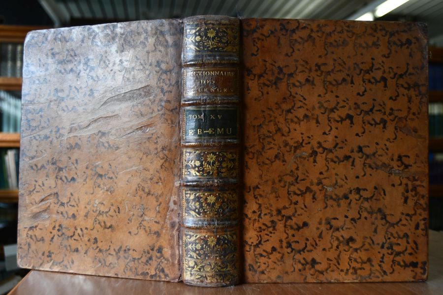Beschreibung Einband berieben, bestoßen, am Rücken teilweise angeplatzt. Innen gelegentlich etwas fleckig. Insgesamt recht gut erhaltener, dekorativ gebundener Teilband. "Die Encyclopédie d’Yverdon ist eine zwischen 1770 und 1780 gedruckte Enzyklopädie in französischer Sprache. Sie wurde in Yverdon in der Schweiz vom Italiener Fortunato Bartolomeo De Felice (1723–1789) (auf Französisch Fortuné-Barthélemy de Félice genannt) herausgegeben. Es handelt sich um ein wichtiges Folgewerk der Encyclopédie von Denis Diderot und Jean Baptiste le Rond d’Alembert. Das Werk umfasst 58 Bände im Quartformat, die sich auf 42 Textbände, sechs Suppléments (Textbände mit Ergänzungen) und zehn Tafelbände (Bildbände mit Illustrationen) verteilen. Ihr Umfang beträgt 37.378 Seiten, mit etwa 75.000 Artikeln und 1.200 Abbildungen. Der Verkauf der gesamten Auflage von ca. 3.000 Exemplaren erfolgte über die Berner Société Typographique und den Buchhändler Pierre Gosse in Den Haag. Im Unterschied zu anderen Folgewerken der Pariser Enzyklopädie ist die Encyclopédie d’Yverdon kein Nach- oder Raubdruck, sondern eine echte Neufassung. Felice ließ den Textkorpus von 34 Autoren redigieren, von denen 27 namentlich bekannt sind. Sie verbesserten fehlerhafte Artikel, ergänzten unvollständige Artikel und fügten zahlreiche neue Artikel hinzu. Darüber hinaus wurde die religionskritische Haltung von Diderots und d’Alemberts Werk in Felices Ausgabe gemildert und durch eine protestantische Sichtweise ersetzt, weshalb das Werk auch bisweilen „protestantische Enzyklopädie“ genannt wurde und vor allem in Nordeuropa große Verbreitung fand. " (Wikipedia)