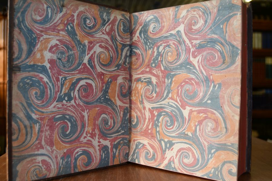 Format 26 x 21 cm, geflammtes Leder auf 5 Bünden mit 2 Rückenschilden und umlaufendem Rotschnitt