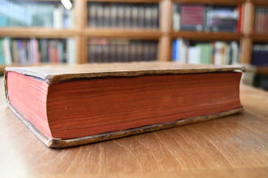 Format 26 x 21 cm, geflammtes Leder auf 5 Bünden mit 2 Rückenschilden und umlaufendem Rotschnitt