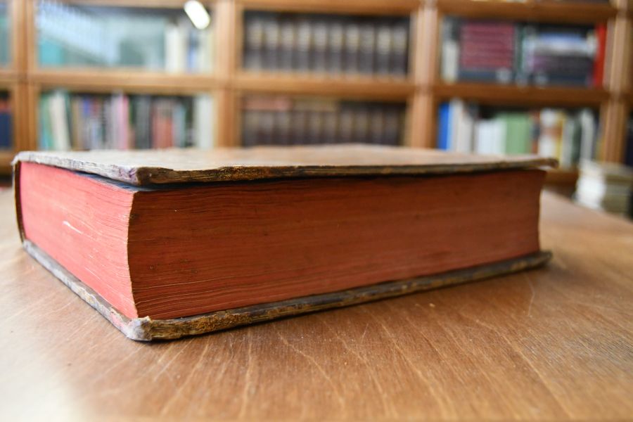 Format 26 x 21 cm, geflammtes Leder auf 5 Bünden mit 2 Rückenschilden und umlaufendem Rotschnitt