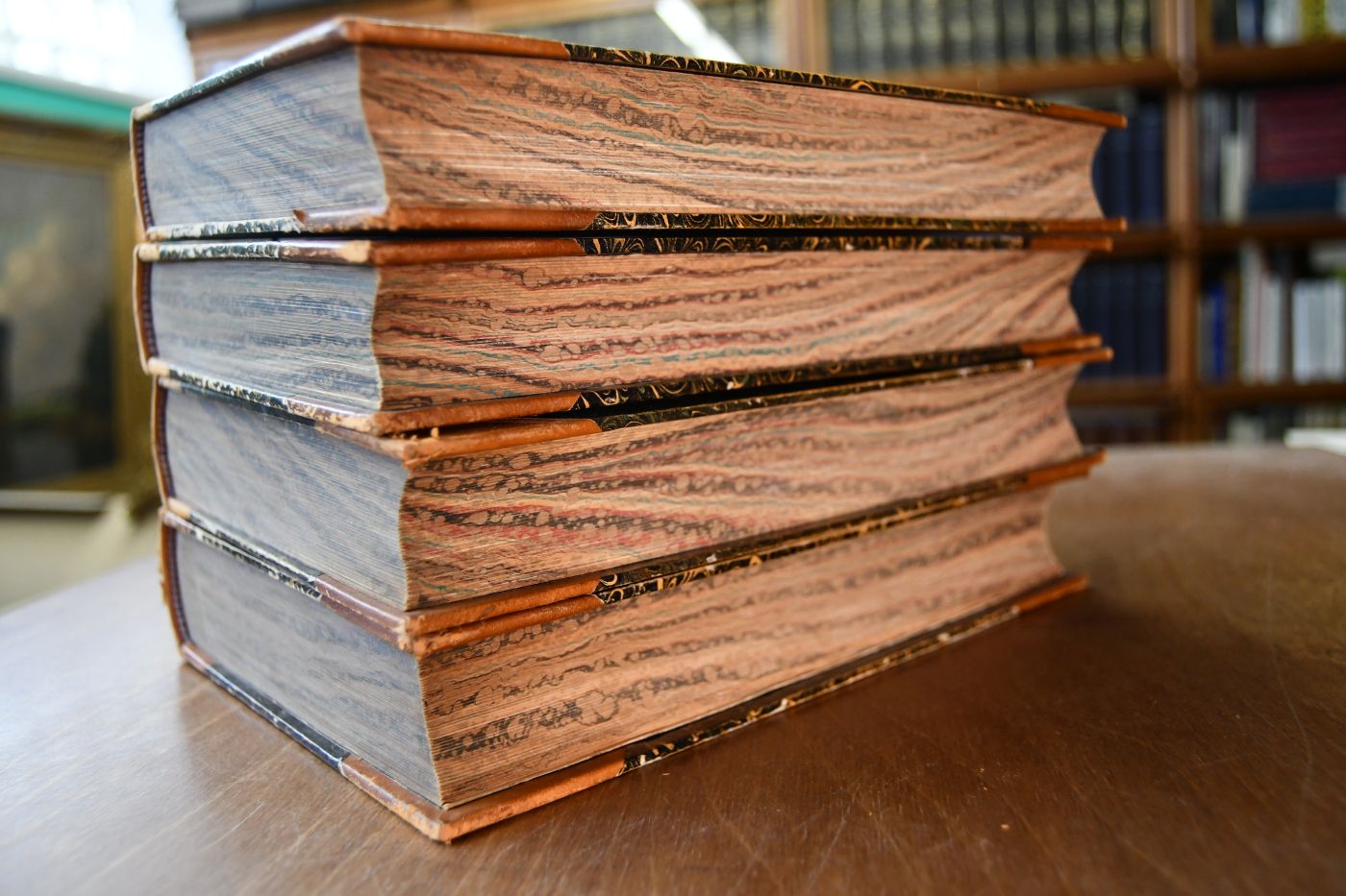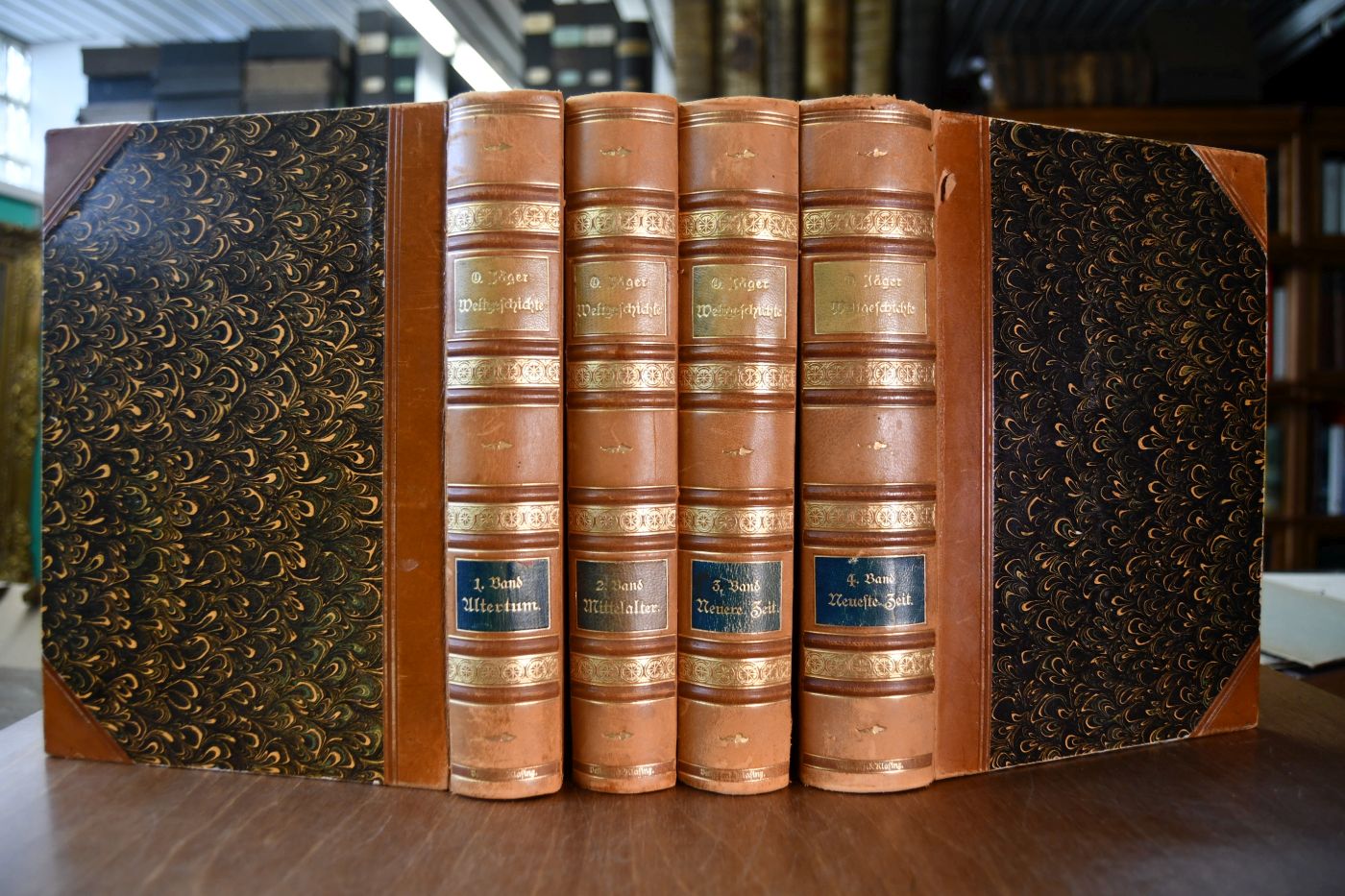 Format 24 x 18 cm, Halbleder mit 2 Rückenschilden und umlaufendem marmorierten Schnitt