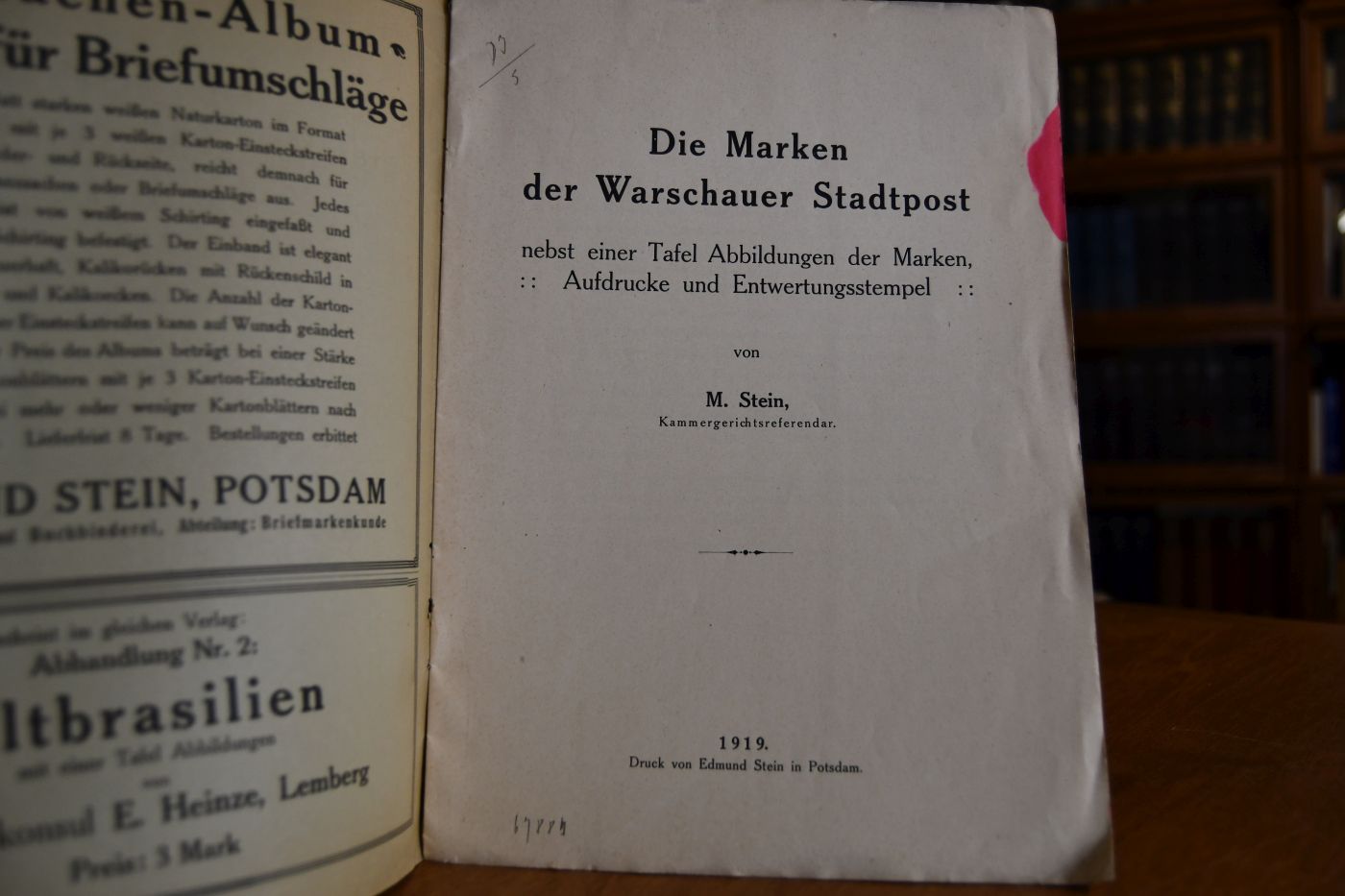 Die Marken der Warschauer Stadtpost nebst einer Tafel Abbildungen der Marken, Aufdrucke und Entwertungsstempel.