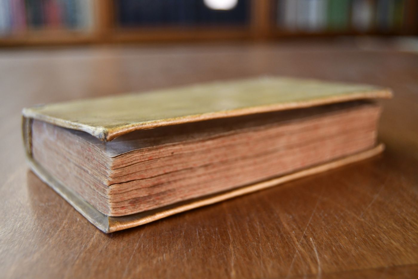 Format 15 x 9 cm, Pergament der Zeit mit handschriftlichem Rückentitel und umlaufenden Sprengschnitt