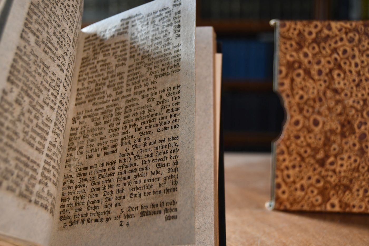 Format 17 x 11 cm, Leder mit Stegrandvergoldung und umlaufenden Goldschnitt im OSchuber