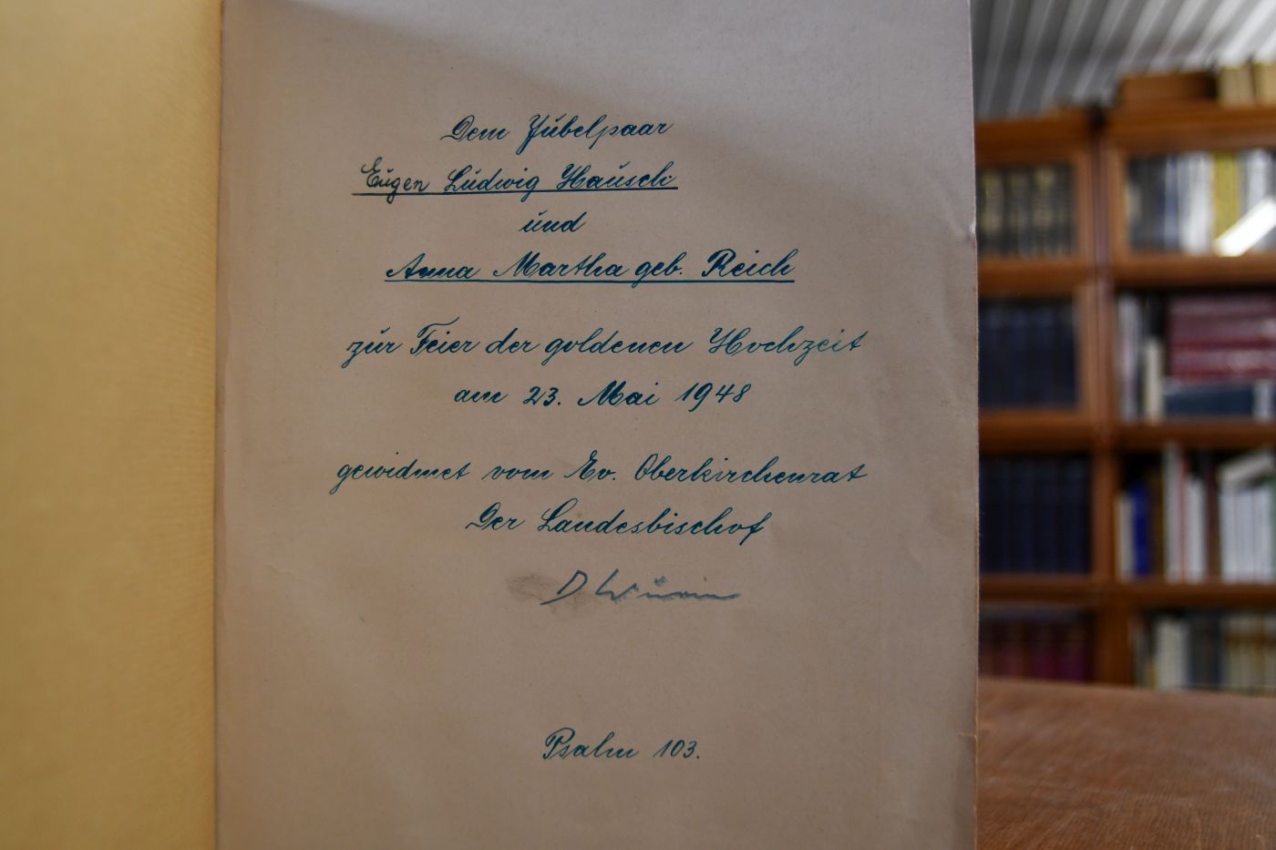 Beschreibung Einband berieben, bestoßen, angeschmutzt und fleckig. Vorderer Falz geöffnet. Handschriftlicher Besitzereintrag auf dem fliegenden Vorsatz. Mit handschriftlicher Widmung zur goldenen Hochzeit auf der Frontinspizrückseite die von Landesbischof Wurm unterschrieben ist.